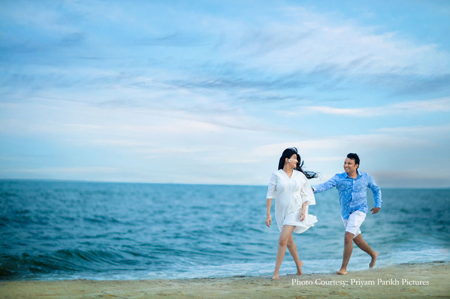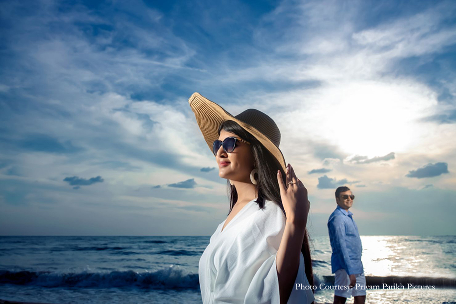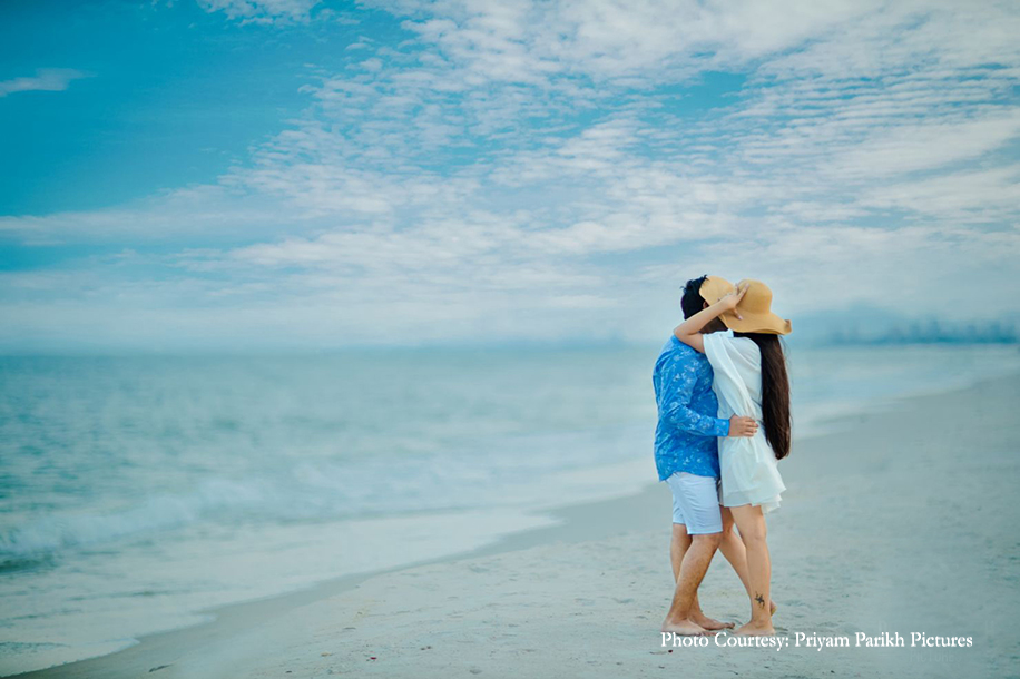 Aniket and Twinkle’s pre-wedding photoshoot in Hua Hin, Thailand, captures their unique bond against the changing hues of the horizon from sunrise to sunset. The surreal shades of blue in frames captured by Priyam Parikh Pictures, framing the couple’s silhouettes, are a sight to behold.