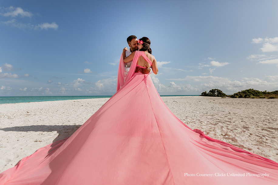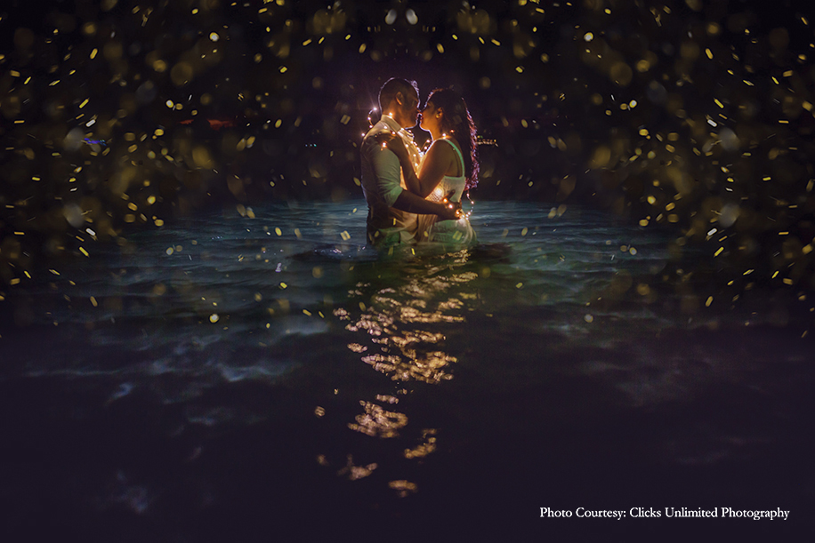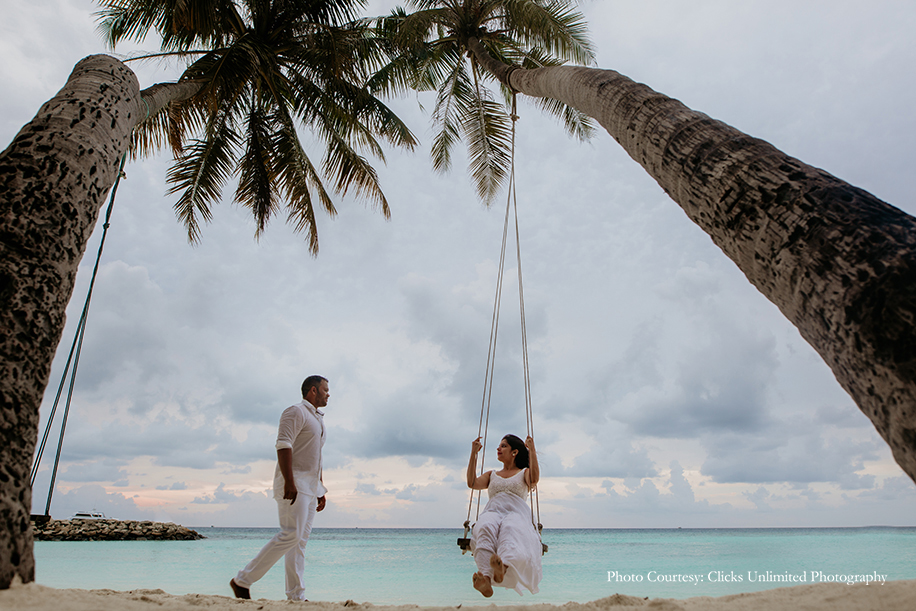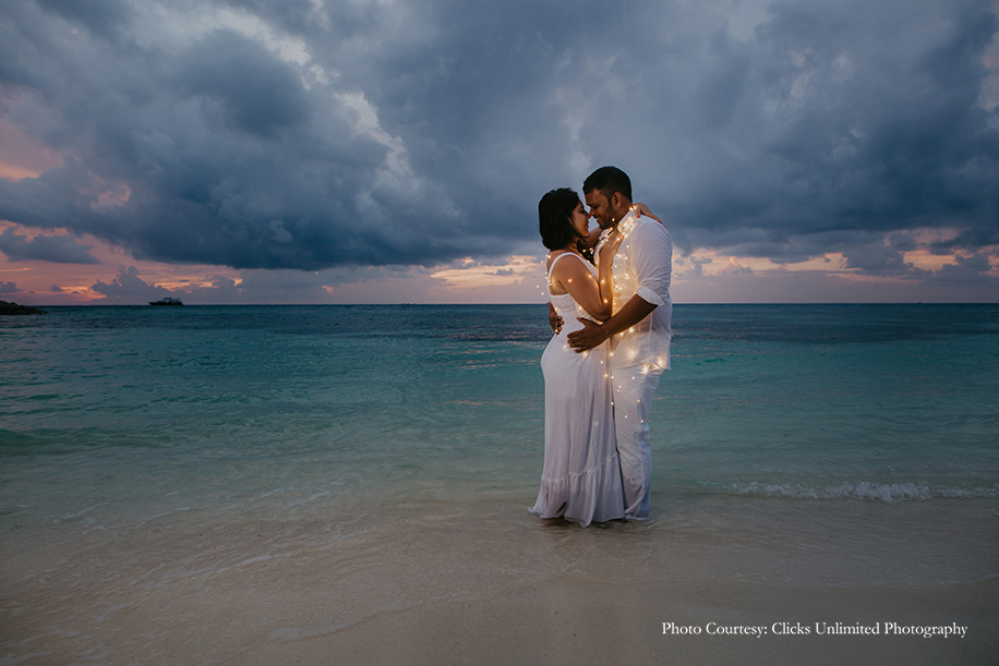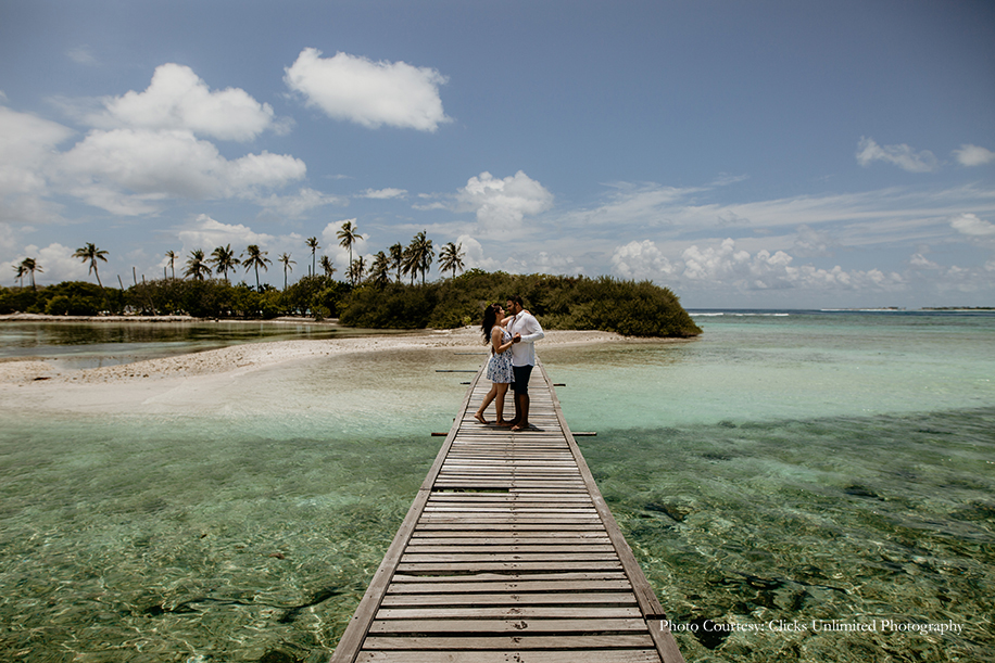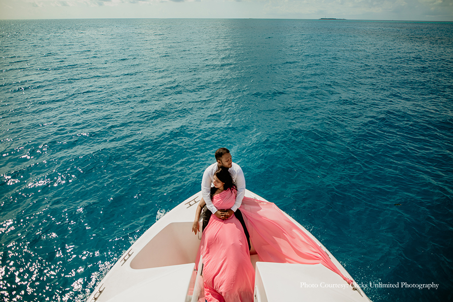 The amber horizon blended with the azure waters of the Maldives to create the most surreal backdrop for Meenakshi and Nevin’s pre-wedding photoshoot. The stunning photos clicked by Clicks Unlimited Photography captures the essence of the idyllic islands beautifully.