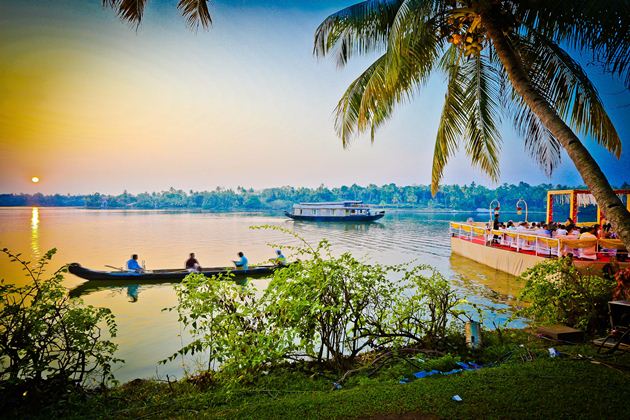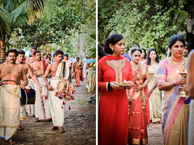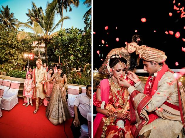 Having chosen Kollam for its breathtaking backwaters, the couple decided to have their wedding ceremony on the water itself, with a perfect blend of cultures and traditions from the North (Karan) and the South (Swetha). Swetha remembers how they discussed the dream-like floating mandap with the planner, “We wanted a red and gold colour scheme, a mandap filled with red roses, the view of the breathtaking backwaters as backdrop.” Wearing a gold sherwani with red trim, Karan rode an elephant as he entered with his baraat. The arrival of the beautiful bride, wearing a classic red Kanjeevaram and traditional temple jewellery was announced by a 10 piece instrument, the ‘panchavadyam’. As a perfect sunset unfolded behind them, the jaimala ceremony was conducted and the couple walked to the mandap to exchange vows following the Arya Samaj traditions.