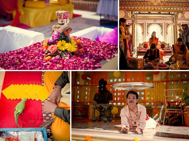 The couple chose a simple mandap and a mango and fuchsia theme for their wedding ceremony at Chunda Palace. “The view from the Chunda Palace terrace is breathtaking and we didn’t want to distract with lots of flowers or fabric.”