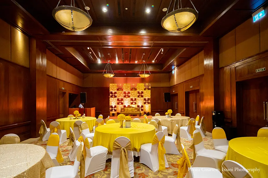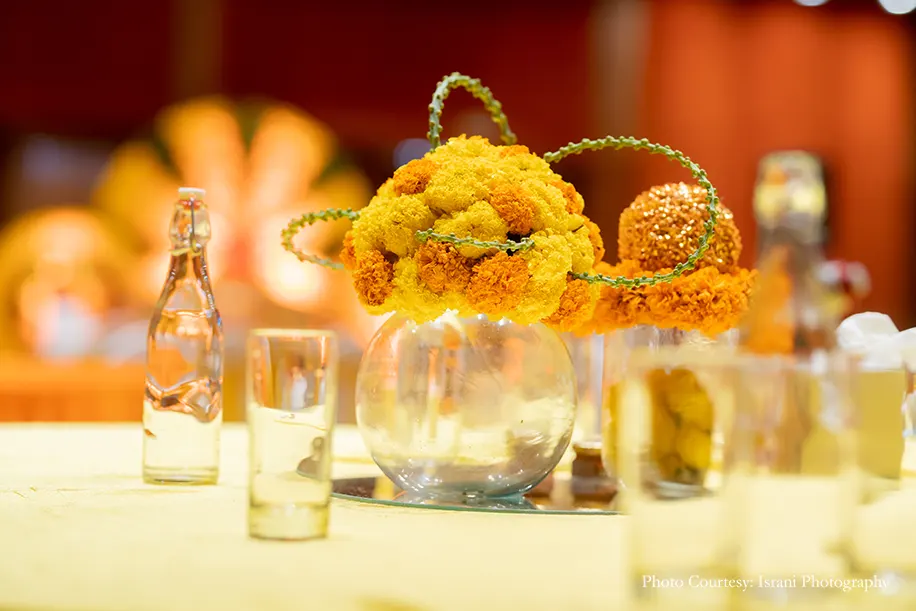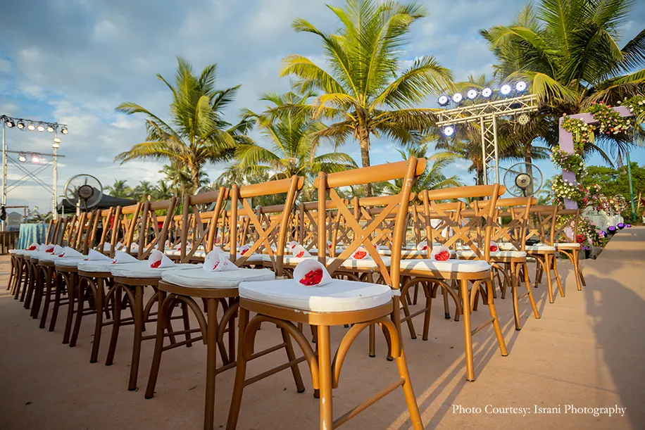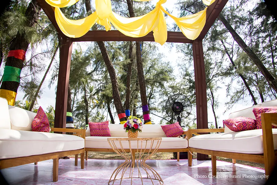 The very next day, a traditional Bhaat ceremony was hosted for both the bride and the groom. Dotted with yellow blooms, this intimate ceremony witnessed both the families coming together and mingling as they celebrated the couple’s union. But then again, no Indian union is complete without a hearty dose of fun and laughter! An interactive beach carnival party was hosted for the guests who got their fair share of playful moments. Describing the event, Achint shares, “The beach carnival party urged everyone to let their hair down and celebrate the moment! Jam-packed with classic games like snakes and ladders, X and 0’s, balloon shooting along with giant jenga, this event had everyone laughing as they unleashed their inner kid. For those guests who wished to relax, masseuses were stationed to give relaxing massages. Nail art counters gave the ladies fun manicures and one also had the option of heading to the gola counter to beat the Goan heat. Additionally, a live Goan Carnival band had everyone burning up the dance floor. Finally, to whet everyone’s appetite, an elaborate chaat counter was set up by the famous Bitto Tikki Wala.”