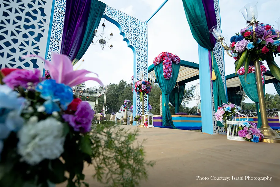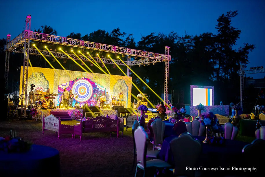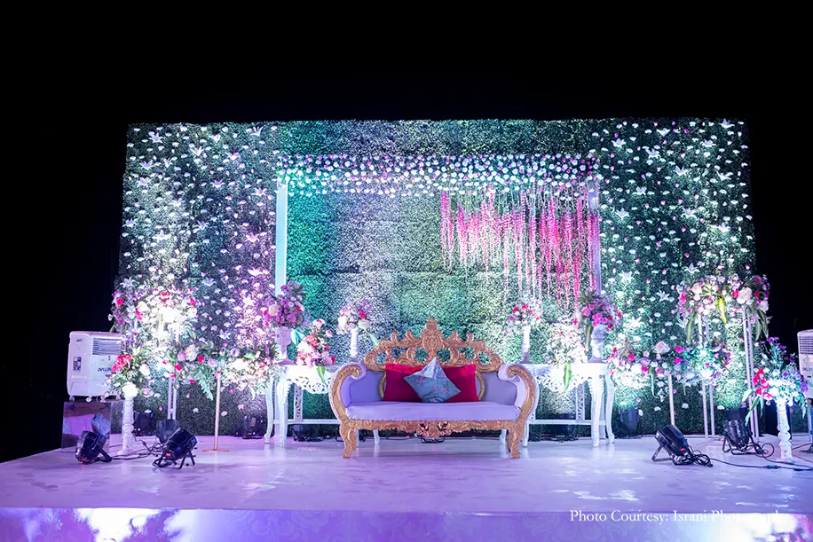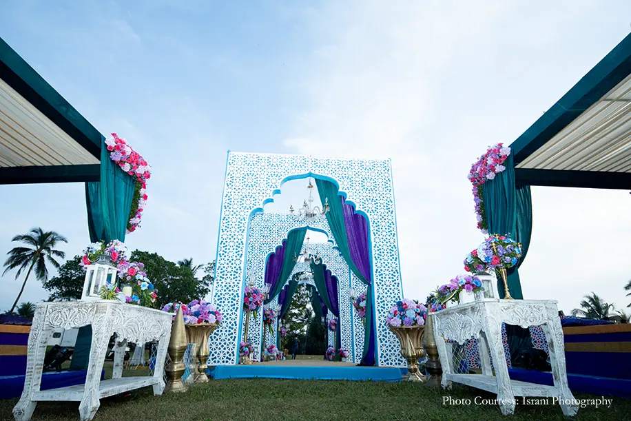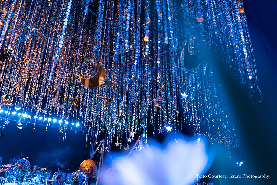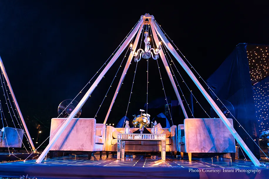 Hosted on the main lawns of the venue, the Sangeet boosted up the glamor stakes with its breathtaking decor that lit up the evening. Furnished with an entrance that resembled the starry sky, this event captivated the senses from the first glimpse itself. Achint recollects, “The Sangeet was planned meticulously as it was an important event for both the families. To make the occasion even more grand and luxurious, we set up a colossal stage on which everyone could shake their leg freely. Punctuated by SFX backdrops, confetti blasts, aerial fireworks, and numerous colorful lights, the Sangeet was an absolute hit which was then followed by a cheerful after party.”
