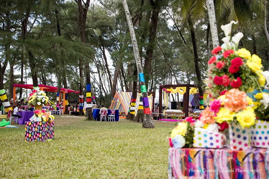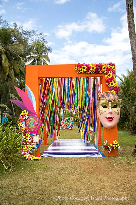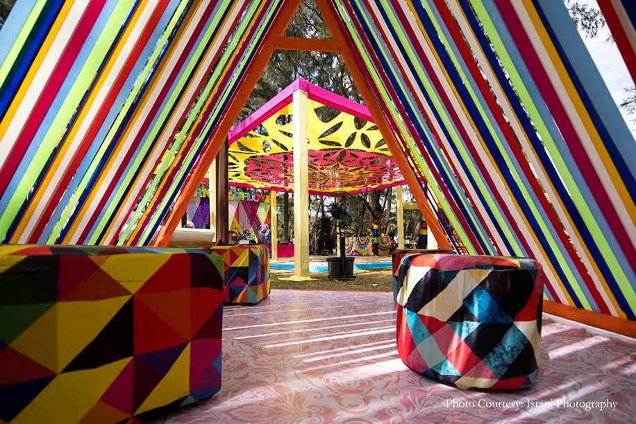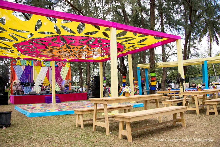 Brimming with colors that contrasted delightfully with the lush green of the lawn, the Beach Carnival Party witnessed the couple making a grand entry heralded by smoke bombs. Adorned with colorful festoons, eye-popping paper flowers, and comfy seating areas, this event had everyone smiling as they ambled around the open lawns.