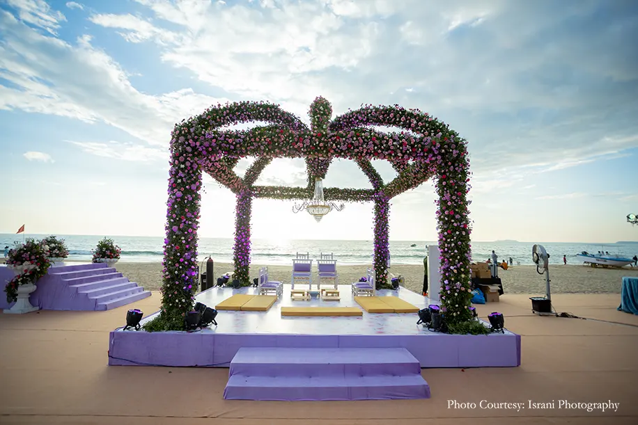 Flanked by a dramatic sunset, this couple’s beachside wedding in Goa with its elegant open-air floral mandap was a treat for the eyes