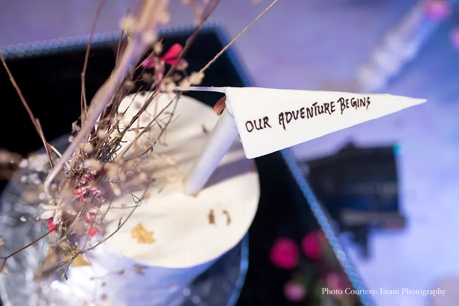 For the big day, all stops were pulled to make sure that the union was a grand, unforgettable spectacle. Seated atop a white-hued vintage car decorated with orchids, the groom made a stylish entry as he grooved to the beats of the dhol along with his best pals. Bedecked with delicate blooms, lush foliage and a majestic crystal chandelier, the open-air mandap exuded serenity as a dramatic sunset acted as the backdrop. Achint shares, “For the Varmala ceremony, a specially crafted musical piece was played by the DJ, which in turn, injected plenty of romance into the moment. To conclude this momentous occasion, a three and a half minute aerial firework show mesmerized everyone. The bride and groom especially, were extremely appreciative of it as they exclaimed their pleasure before proceeding towards the mandap for the phere. Following the wedding, a reception dinner crafted on the lines of ‘The Enchanted Garden’ was orchestrated to celebrate the union. At this event, each table was replete with flowers and greenery and there were also photo booths where the guests could click pictures which also acted as souvenirs.