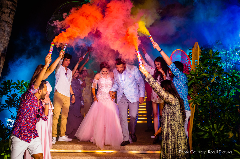 Friends of the couple escorted them to the venue under a vibrant cloud of colorful smoke bombs.