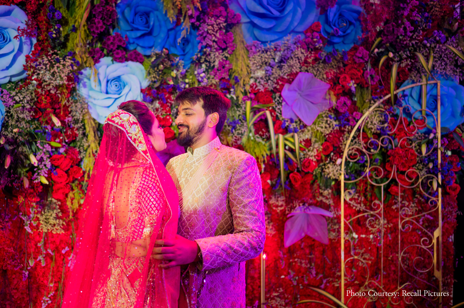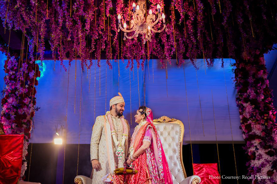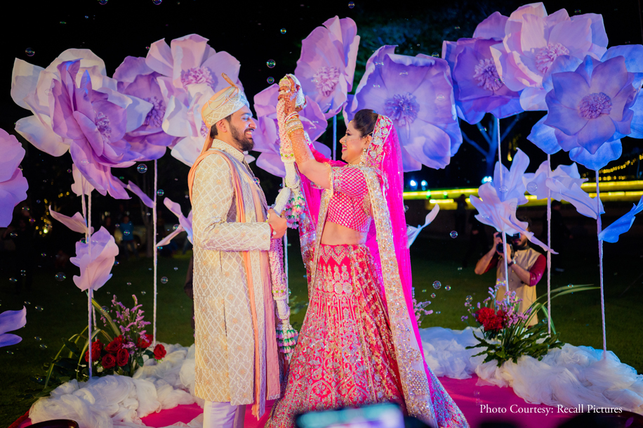 They exchanged garlands in front of a backdrop comprising giant petals and floral structures.