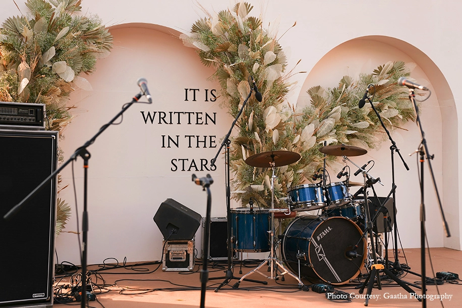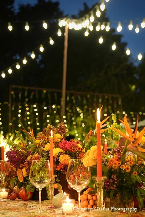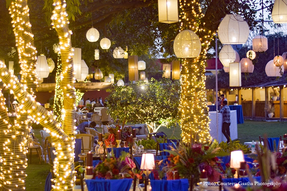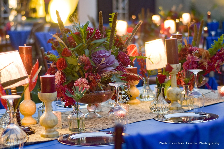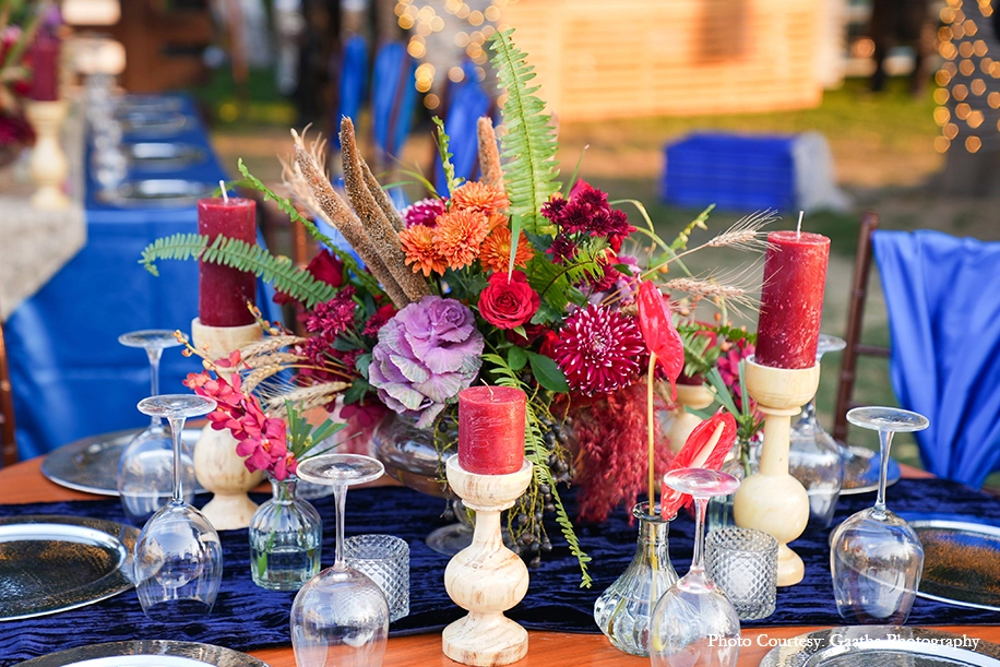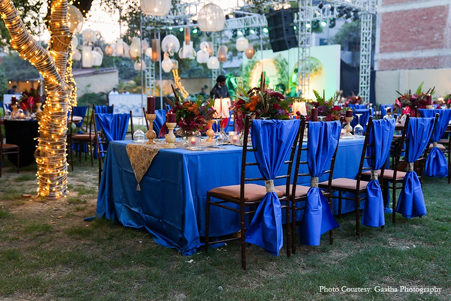 Aptly labeled ‘It’s written in the stars’, the Cocktail event flaunted rich tones of blue that were set off by deep red hues. Namita shares, “We were intent on creating a fairytale-like atmosphere in the residential backyard and through sheer hard work, we made it possible! Yarn lamps lit up the celebration while cozy lounges accessorized with soft throws kept the guests warm under the open sky. Merlot-hued candles bathed the tables in a warm glow as everyone tucked in the delicious spread.” While the wedding looked stunning, it also scored high in the eco-friendly department. Namita adds, “After the events, all flowers used in the decor were sent to a well-known flower recycling company that turned them into beautiful products. This ensured that there was minimal wastage and it also kept our conscience guilt-free.”