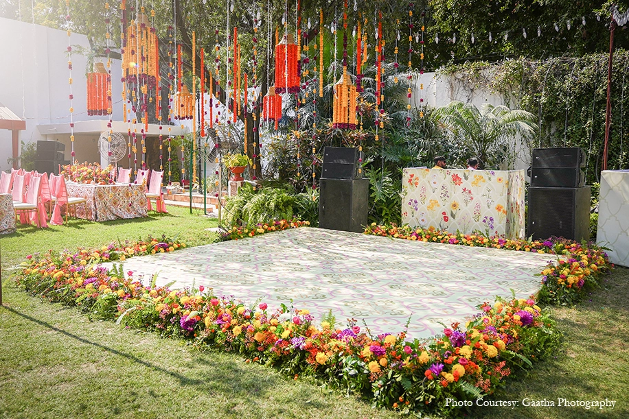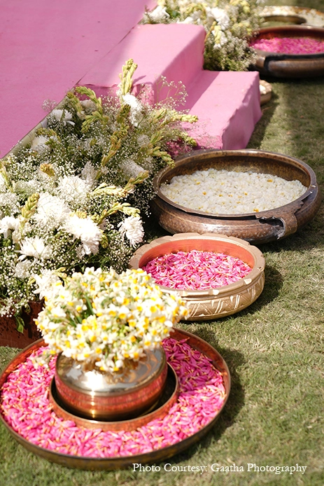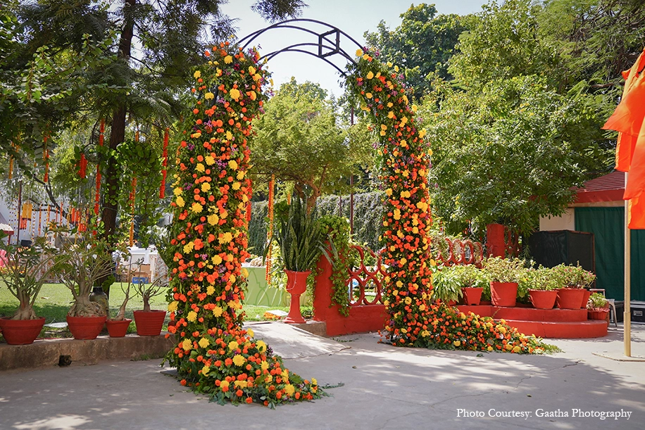 Describing the kind of brief she received from the couple, Namita Jain from Mogra by Namita shares, “Since this was a home-based wedding, Shubhangana wanted her home to be adorned with all things pretty. The main aim was to ensure that everything looked natural within the home setting replete with cozy nooks and vivid flowers. Additionally, the bride was quite specific about the blooms to be used. She has a soft corner for Indian flowers and wanted us to use as many of them as possible!”