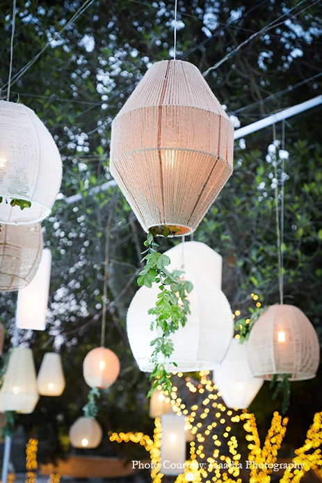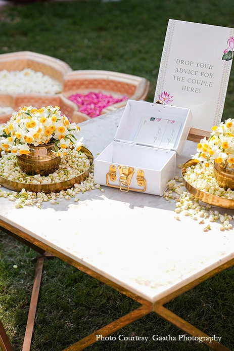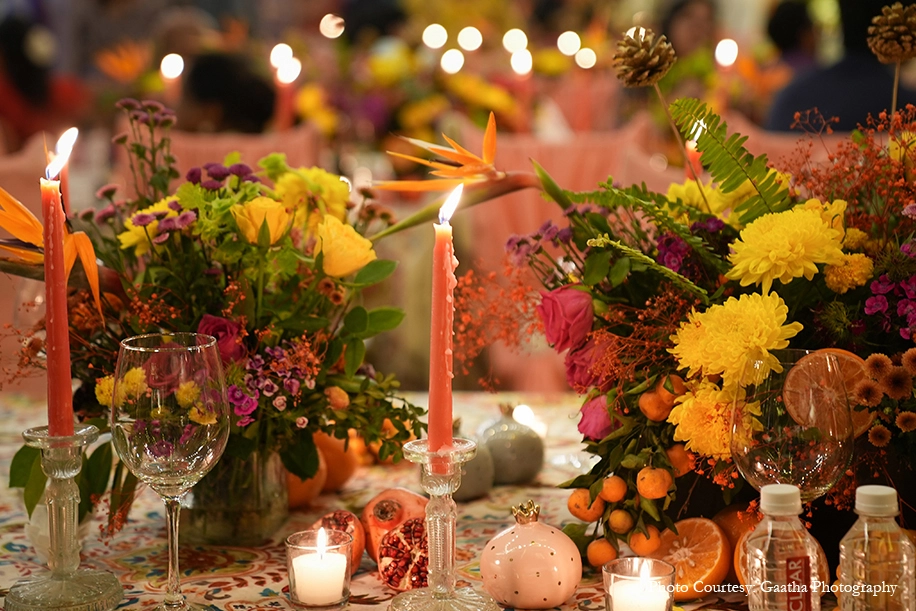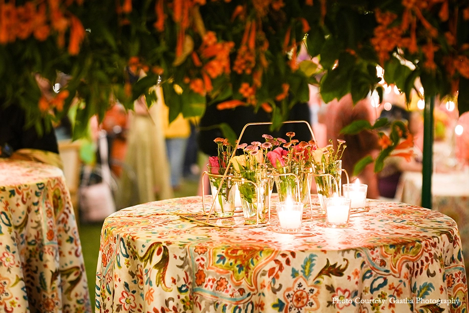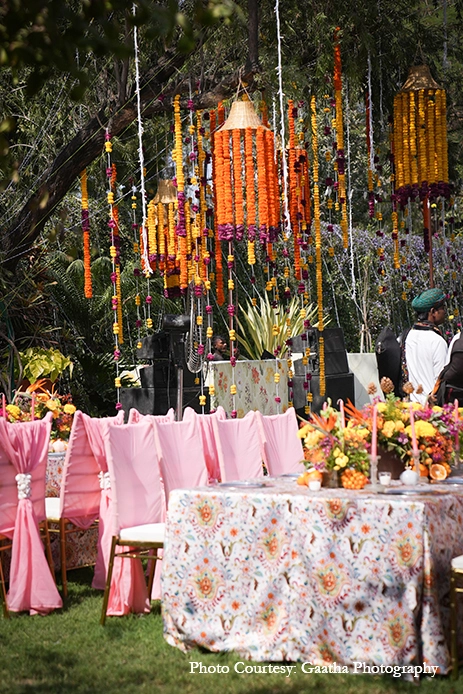 Kicking off the celebrations was a vibrant Mehndi sundowner in a ‘Quirky Marigold’ theme where bright Marigolds accentuated the pink tones used in the decor. Adding a dash of freshness under the dazzling sun were citrus-fruit adorned centerpieces on the table. Namita shares, “We used Marigolds generously whereby the flower garden around the dancefloor and colorful hangings were laden with marigolds with pretty pink flowers scattered in between them that struck an attractive contrast. Strategically placed cane baskets further added to the quirk factor of the event.”
