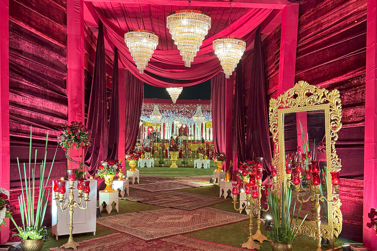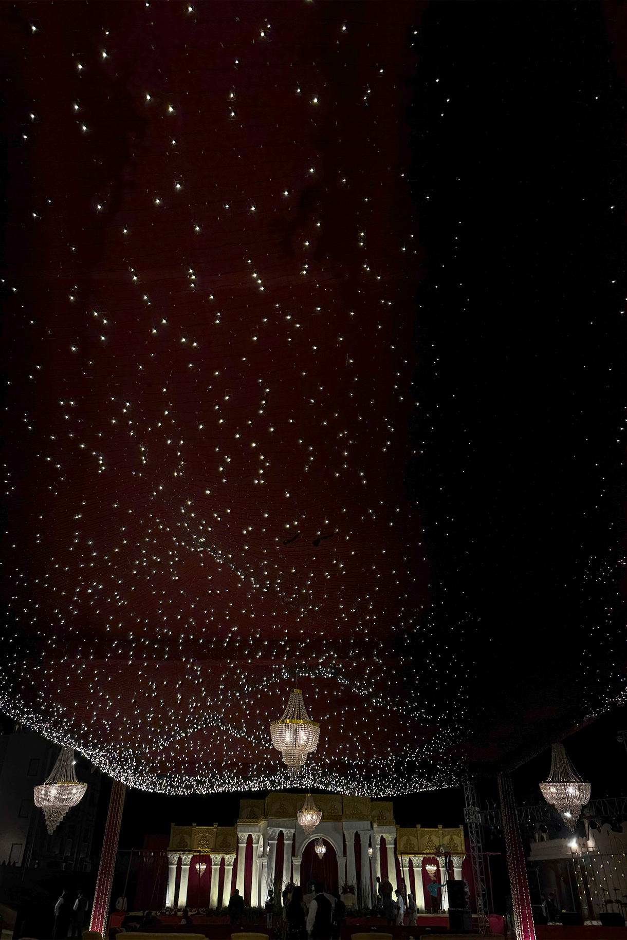 The celebrations concluded with an opulent red reception, adorned with luxurious velvet drapes, intricate candlestands, and sparkling chandeliers. A flowing canopy of twinkling lights enveloped the venue, creating an enchanting atmosphere. It was a fitting finale to this grand wedding.
