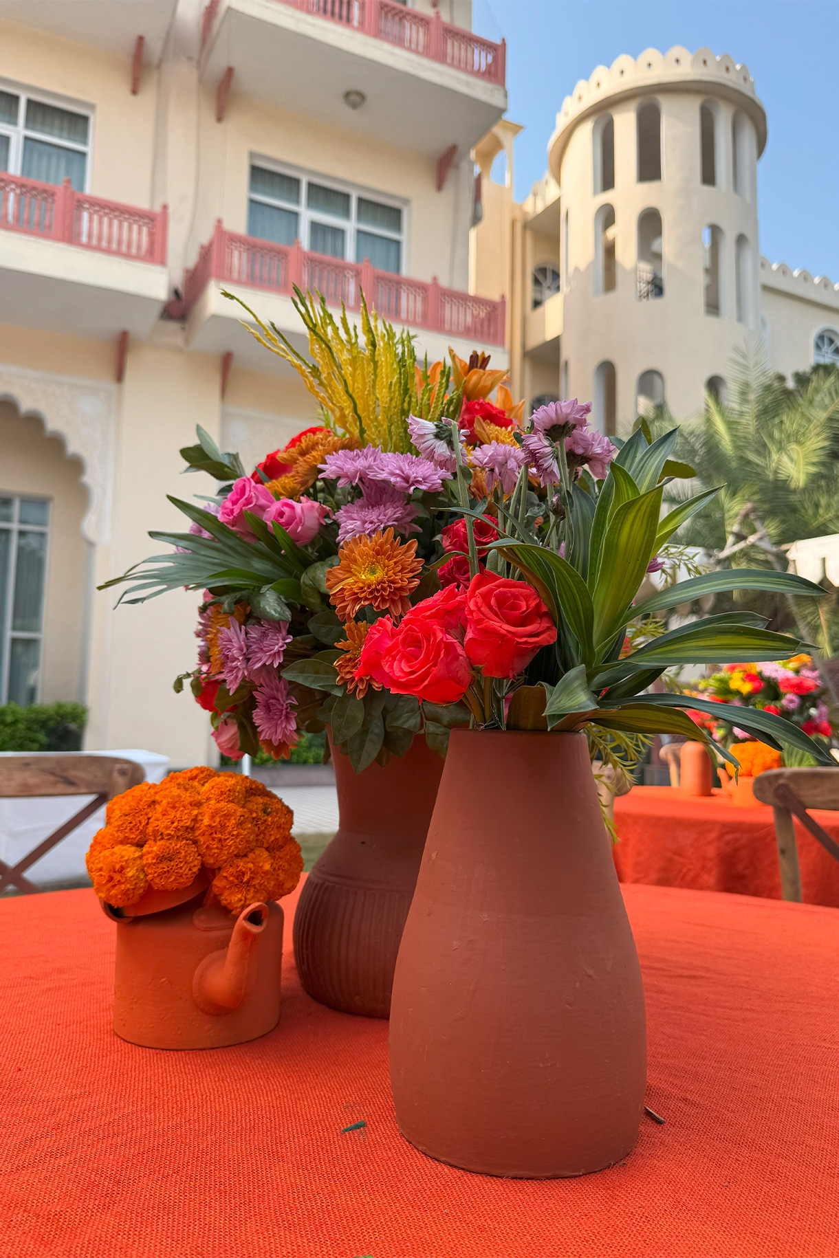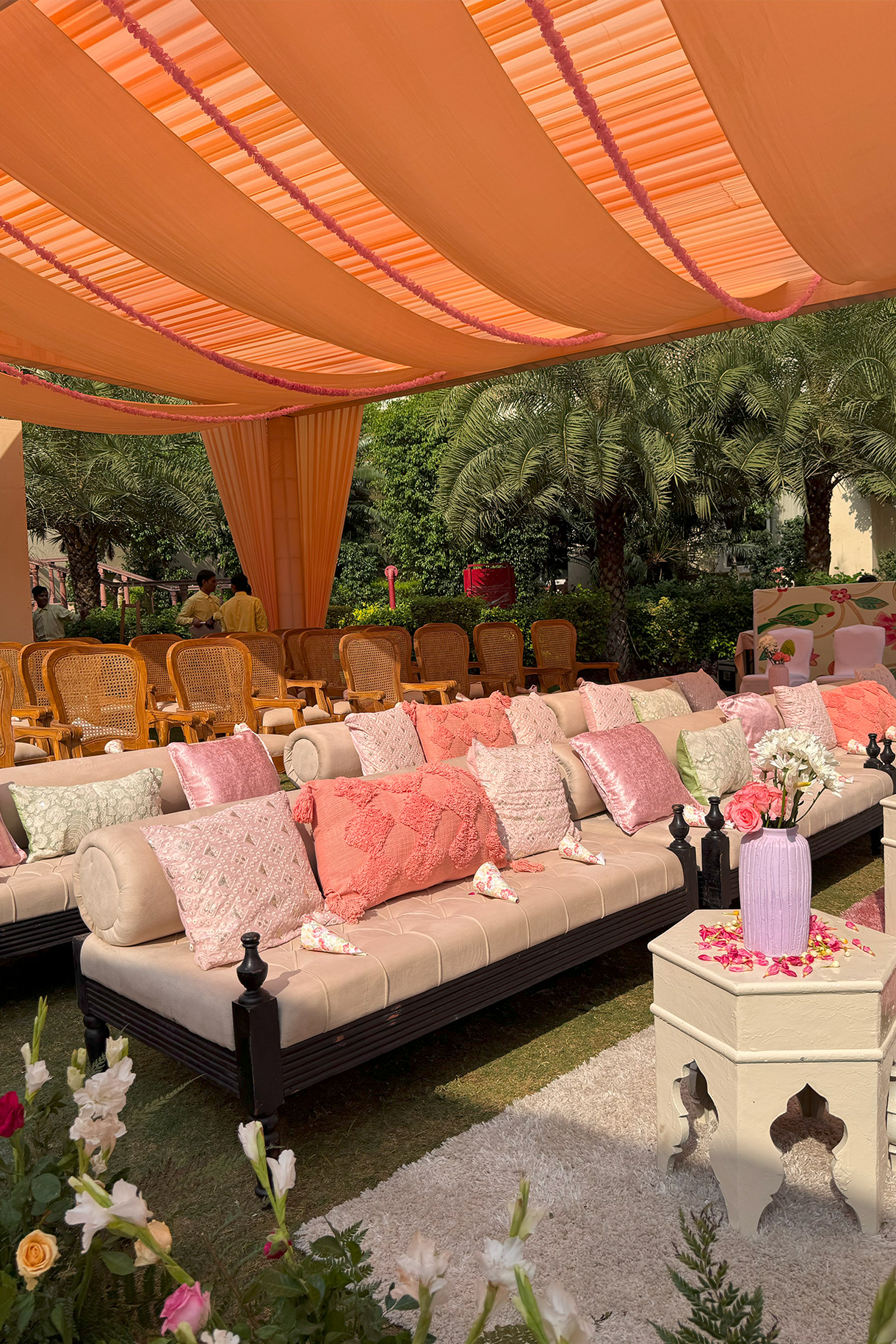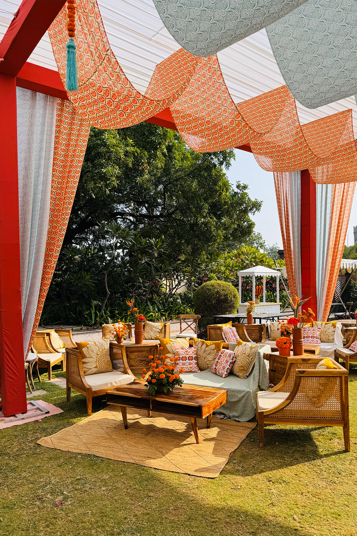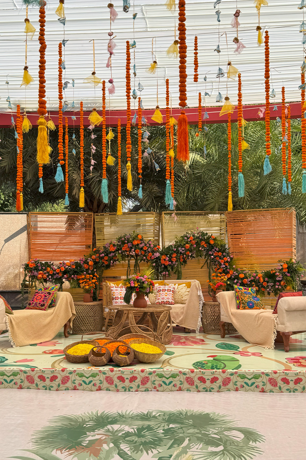 The Haldi exuded a charming Indian rusticity, featuring warm earthy hues of beige and brown, complemented by an abundance of cane furniture and patterned drapes. Bursting with life, vibrant flowers, tassels, and cushions added splashes of color, while baskets brimming with marigold petals lent a traditional flair.