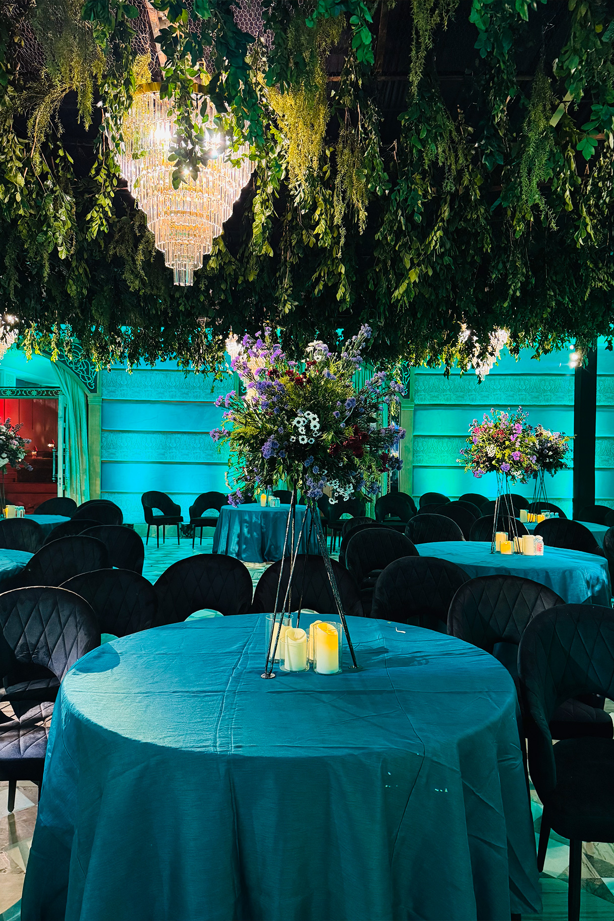The Sangeet transported the guests to an enchanted forest, adorned in lush green hues. A ceiling of dense foliage mingled with sparkling crystal chandeliers created an enchanting atmosphere, enhanced by golden accents and flickering candles.