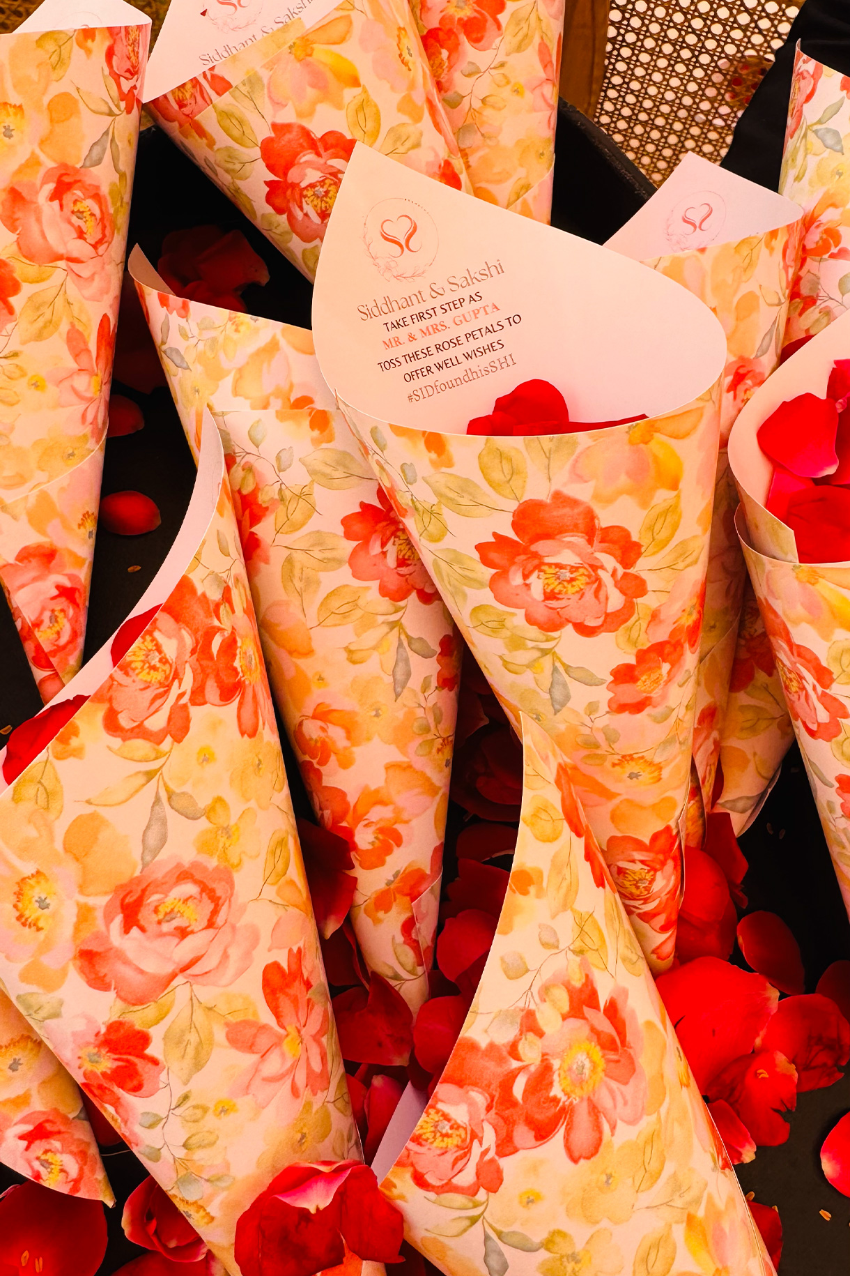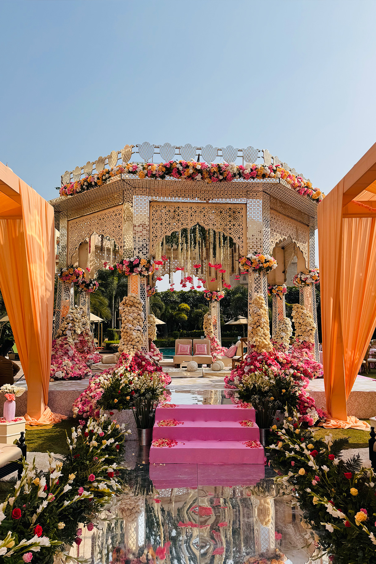 The wedding was imagined in hues of pink and peach, adorned with stunning floral arrangements. A mirrored aisle, bordered by blossoms, led to a mandap that showcased the venue’s opulent charm through its elaborate design. Guests held flower cones brimming with petals, ready to shower the couple in celebration as they exchanged vows.