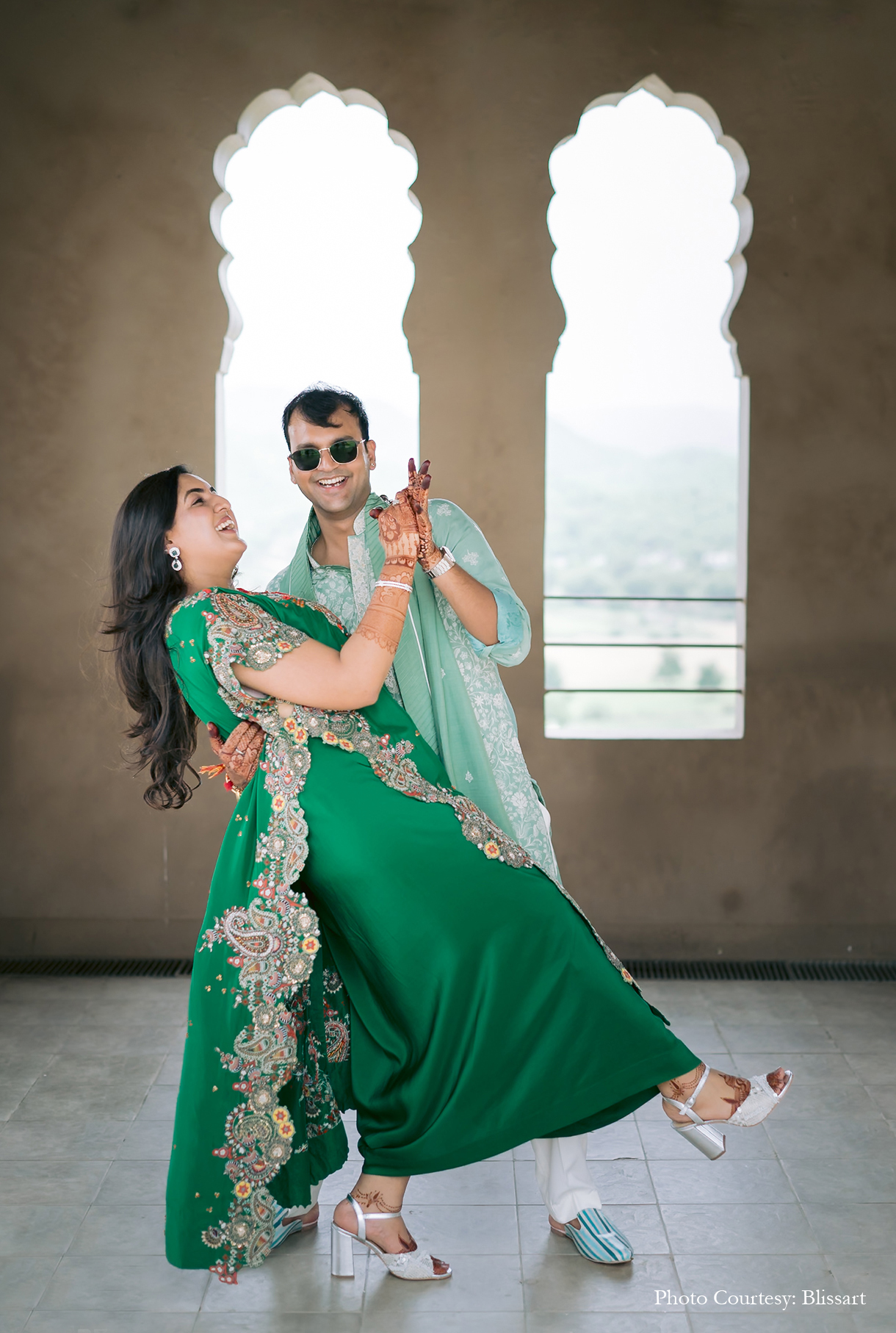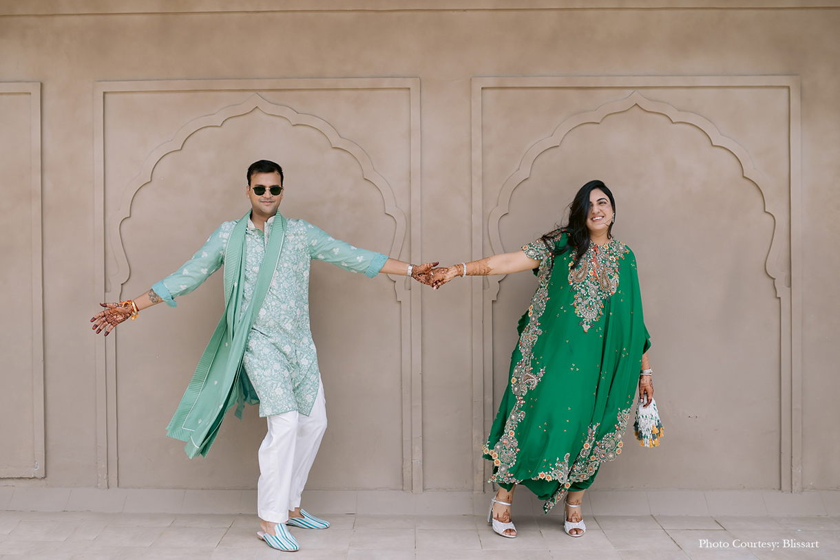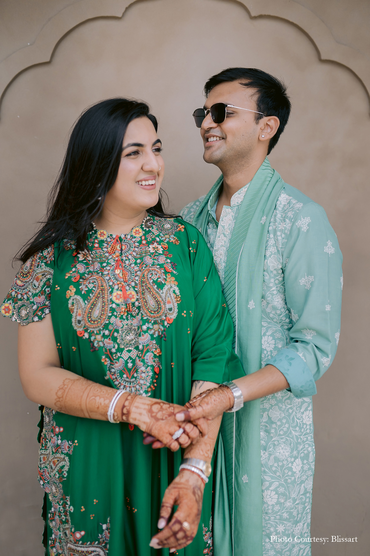 To mark the arrival of the guests, the festivities commenced with a sit-down lunch and mehndi celebrations. A vibrant palette of flowers lit up the seating arrangements while live music set a joyous tone for the occasion. Dressed in matching green ensembles, the couple mingled and welcomed their loved ones, while Henna artists lent their creativity to beautiful mehndi designs for friends and family.