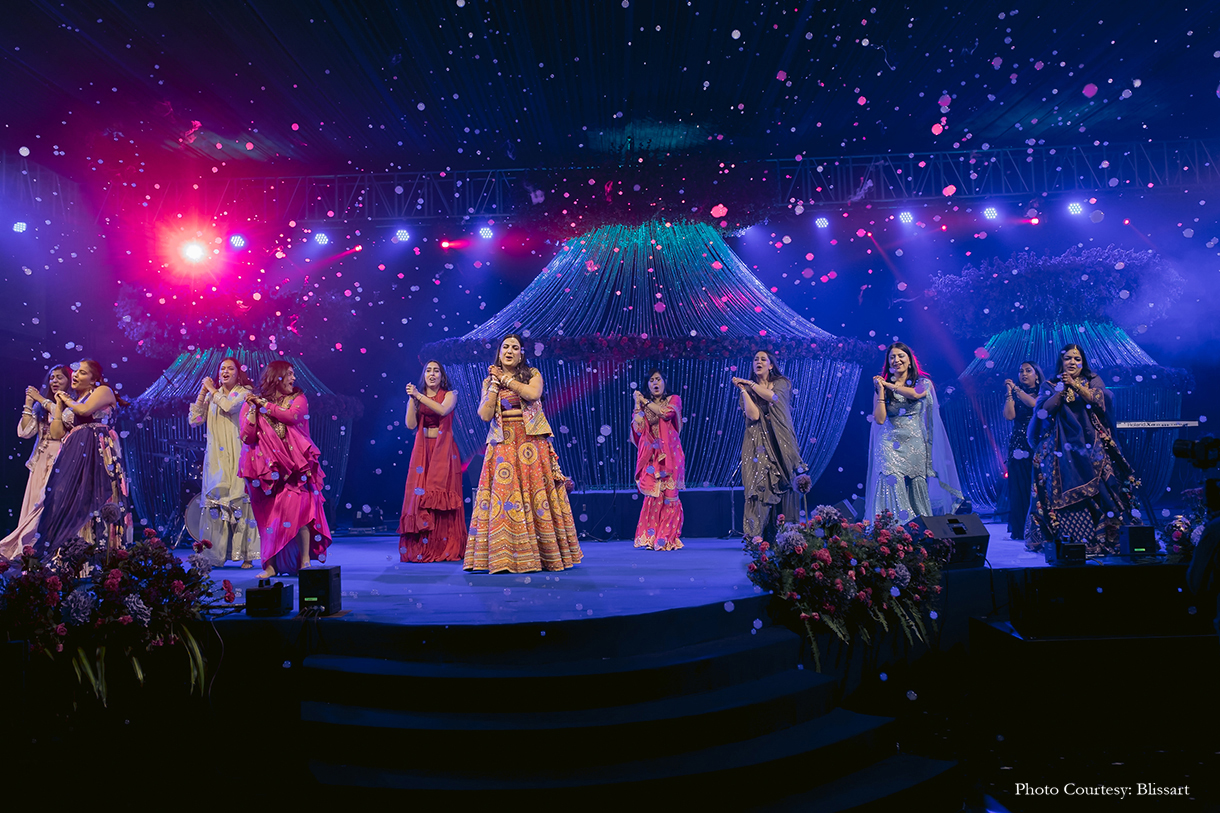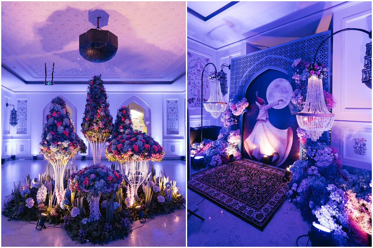A confluence of magnificent crystal chandeliers, stunning flower arrangements, plush seating, and jewel-toned lights, the Sufi Night Sangeet was high on splendor. The bride opted for a stunning lehenga and jacket with a boho touch, and the groom matched her in a colorful Bandhgala jacket for the evening. Scintillating dance performances made the night memorable as everyone let their hair down and enjoyed themselves.