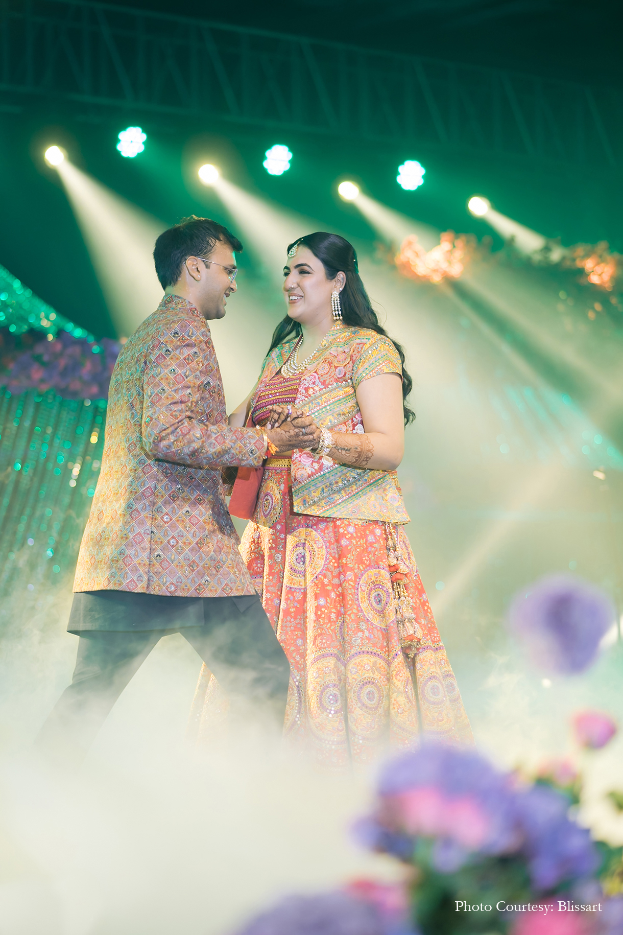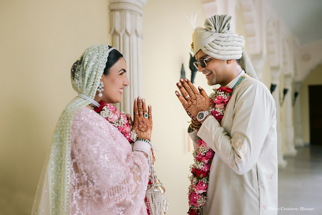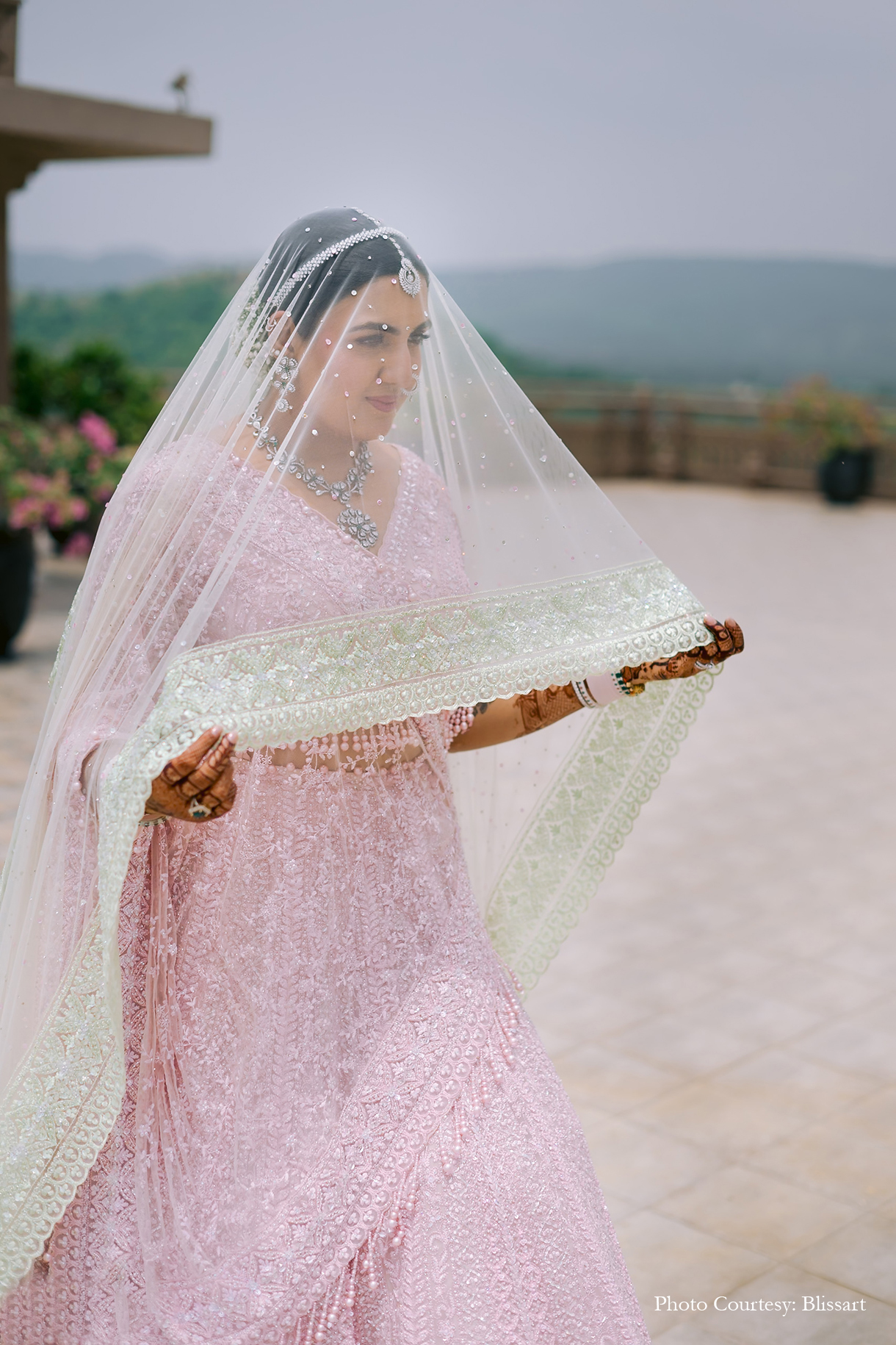 Brimming with stunning flowers, the wedding ceremony was a pastel wonderland. Inspired by the intricacies of temple architecture, the floral mandap was a sight to behold. The bride looked ethereal in a blush pink lehenga with all-over beading, which she teamed with a pistachio green veil to match the groom’s ensemble. The couple was the portrait of happiness as they exchanged garlands and vowed eternal love.