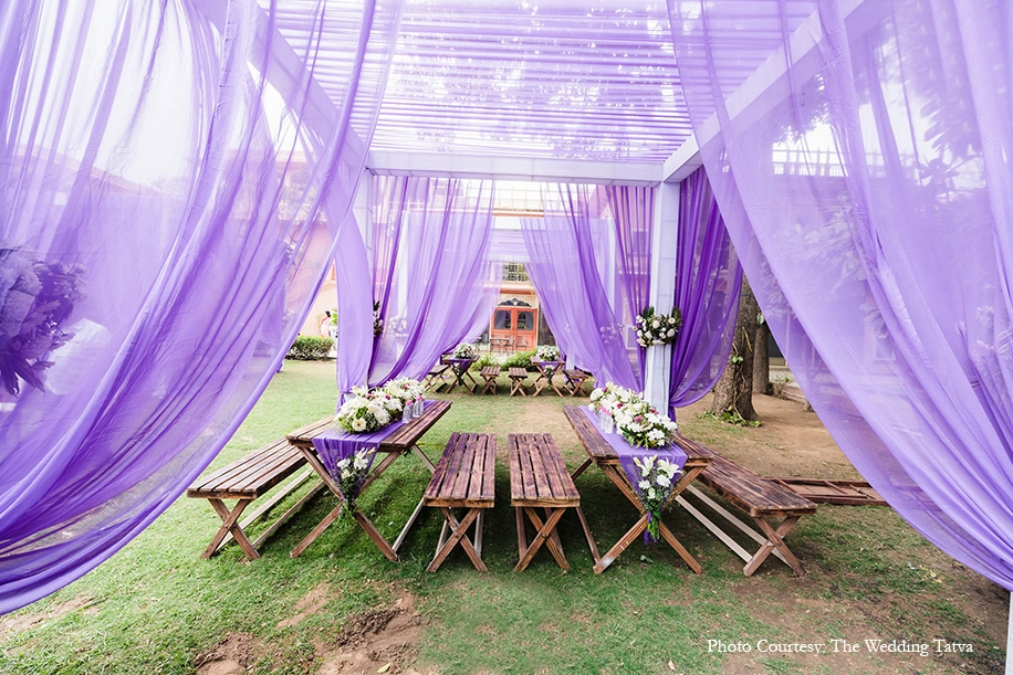 Hosted under the bright sunlit sky, the welcome lunch was a breezy one swathed in shades of lavender and white. Simran shares, “This lunch was a last moment addition to the list of events. Keeping the casual environment in mind, we decided to add a modern spin to the lunch with lavender and white drapes that were paired with delicate white florals. Additionally, earthy wooden tables gave a rustic feel to the lunch!”
