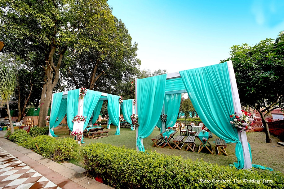 Showcasing the couple’s affinity for tradition, the Haldi decor was orange-hued with marigold garlands and yellow roses adding a generous dash of cheer to the proceedings. Breezy canopies with sheer orange drapes were constructed to ensure the bride and groom were sheltered from the sun as they got their pre-wedding glow on.