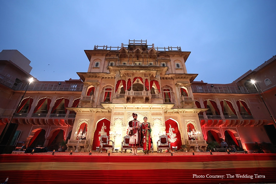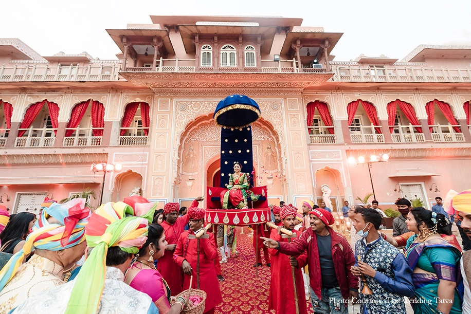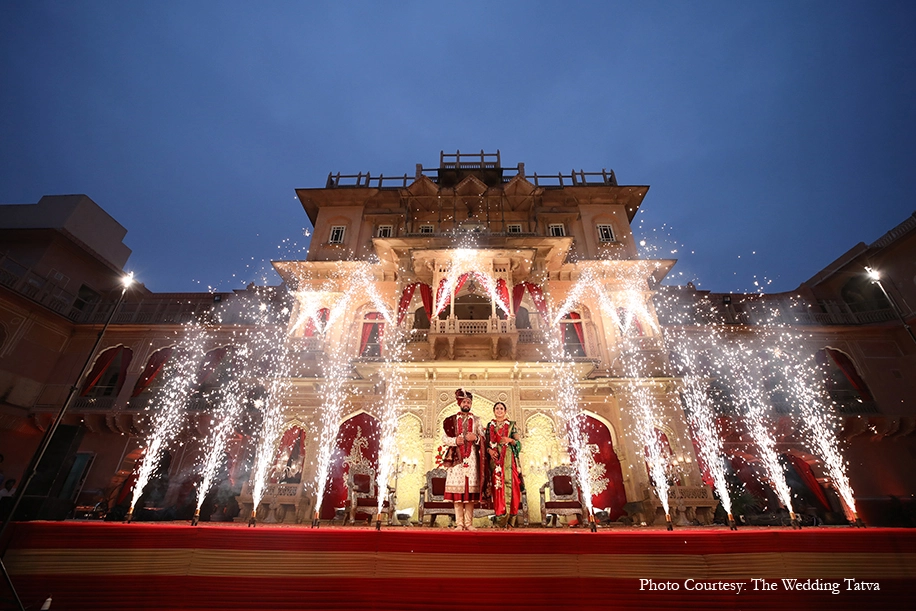 Opting for a rich color palette filled with gold and red hues, the wedding exuded a regal vibe that was in tandem with the architecture of the venue. True to their vision, the planning team included subtle elements like red drapes, gold chairs, and delicate crystal lamps that accentuated the luxurious Rajasthani architecture. Seated on an elephant, the groom made a grand entry while the bride wasn’t far behind as she made her way to the mandap seated in a palki. Following Maharashtrian rituals, the wedding was filled with romantic moments but the highlight was the sunset varmala which lent a magical air to the proceedings.