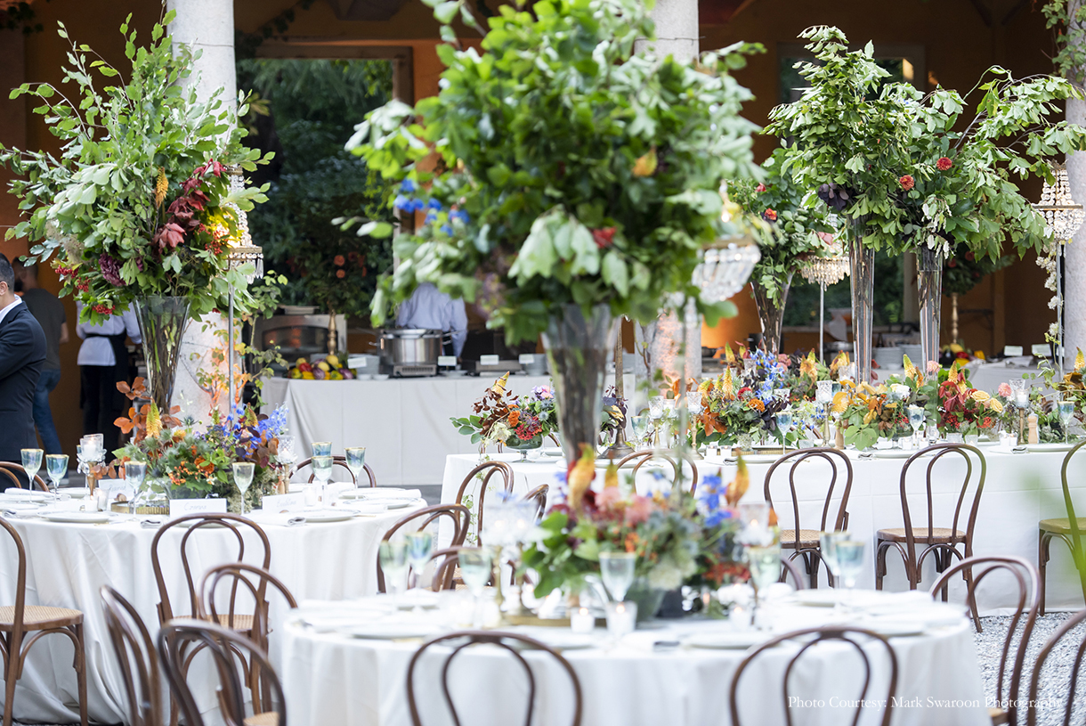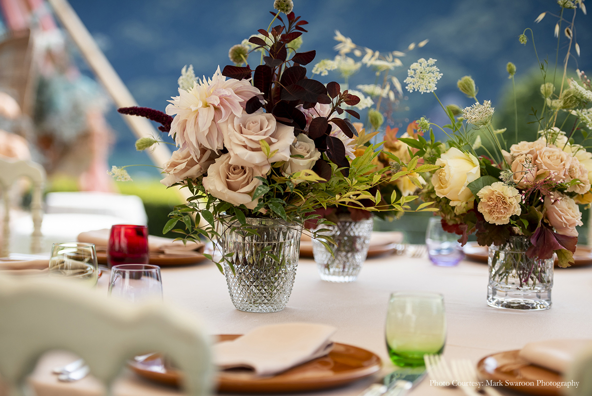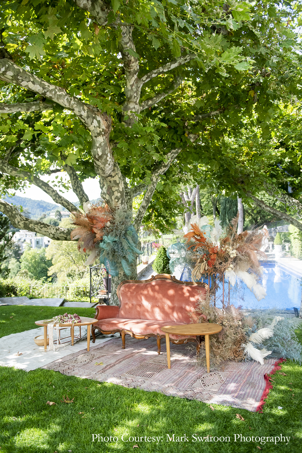 The Mehndi celebration saw a captivating color scheme of peach, pink, and blue, embodying energy, joy, and hope. Adorned with wicker furniture and an exquisite arrangement of dried and fresh flowers, feathers, and flowing drapes, the atmosphere embraced a bohemian elegance. The earthy tones harmoniously contrasted with the lush greenery of the Villa Bonomi gardens, creating an enchanting setting.