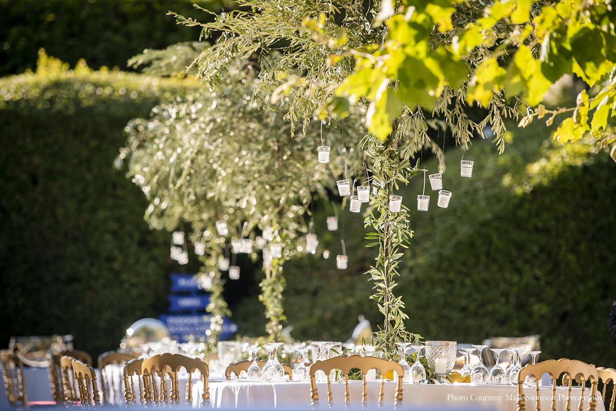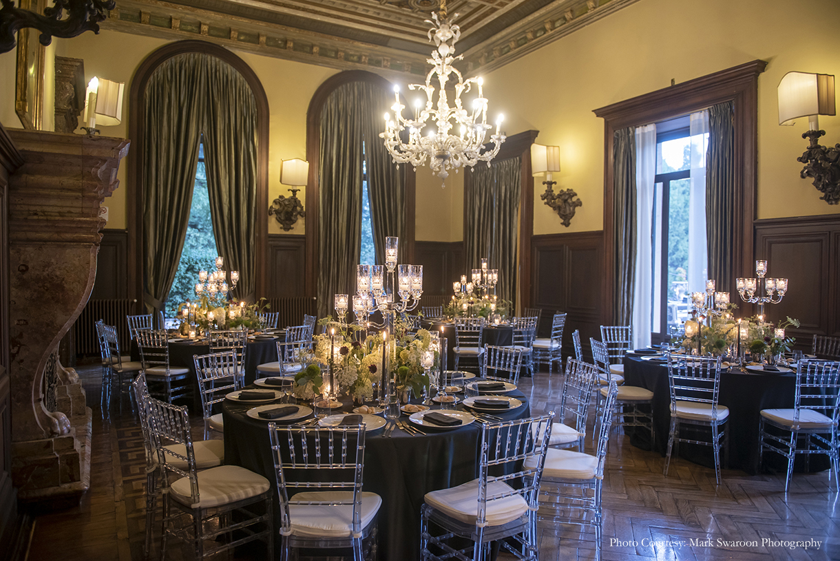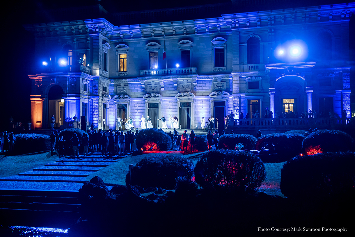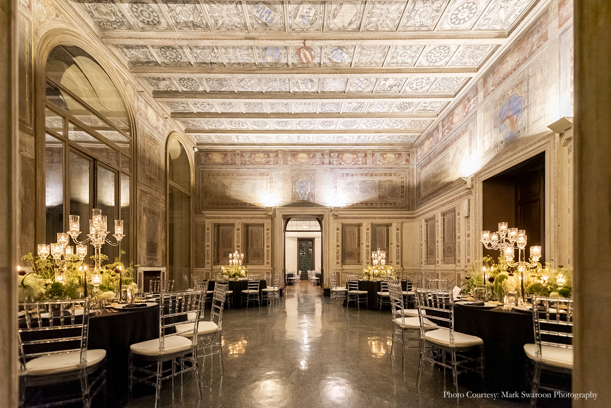 The Sangeet function exuded opulence with its deep emerald décor, embodying a sense of balance and harmony, enhanced by golden accents, exquisite chandeliers, elaborate candlestands, and velvet green floor-to-ceiling drapes.Performances unfolded gracefully on the porch of Villa Erba, culminating in an elegant sit-down dinner indoors.