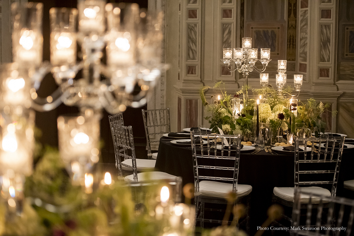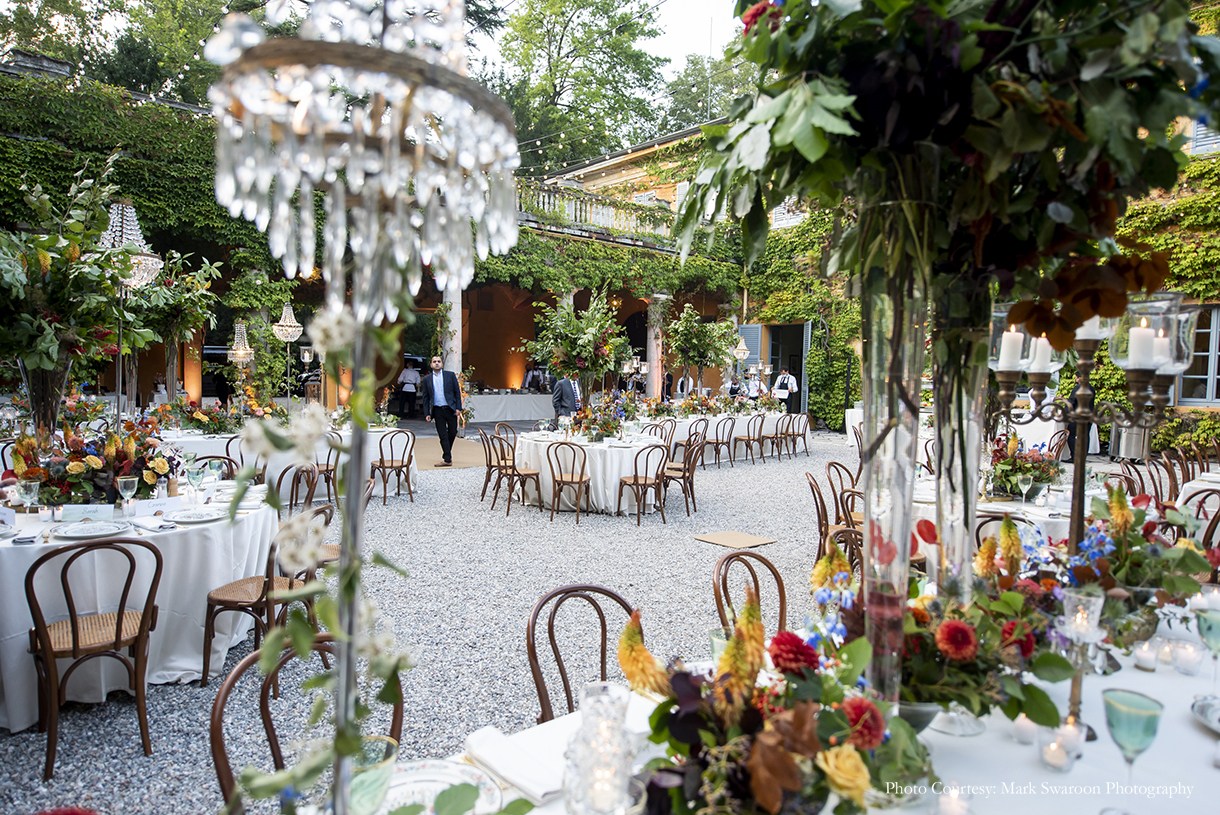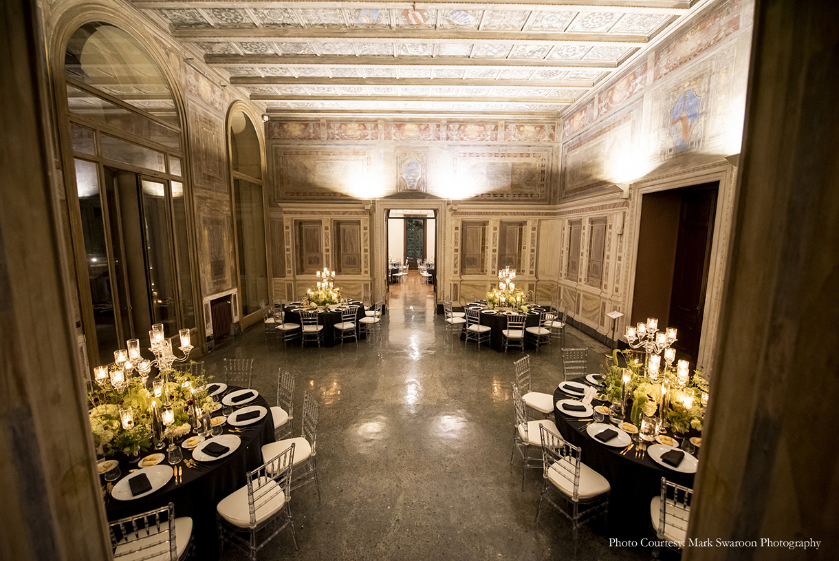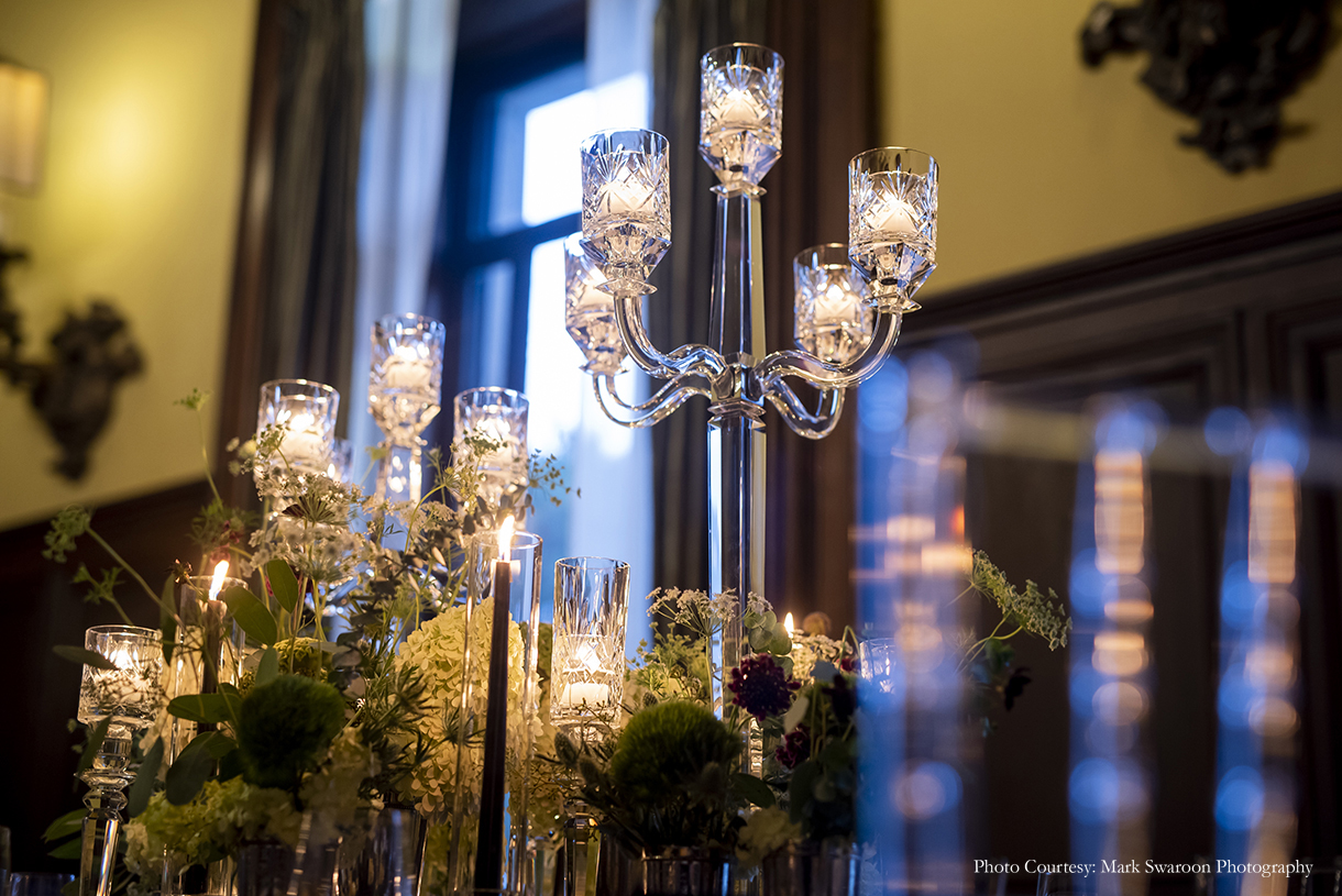 The Sangeet function exuded opulence with its deep emerald décor, embodying a sense of balance and harmony, enhanced by golden accents, exquisite chandeliers, elaborate candlestands, and velvet green floor-to-ceiling drapes.Performances unfolded gracefully on the porch of Villa Erba, culminating in an elegant sit-down dinner indoors.
