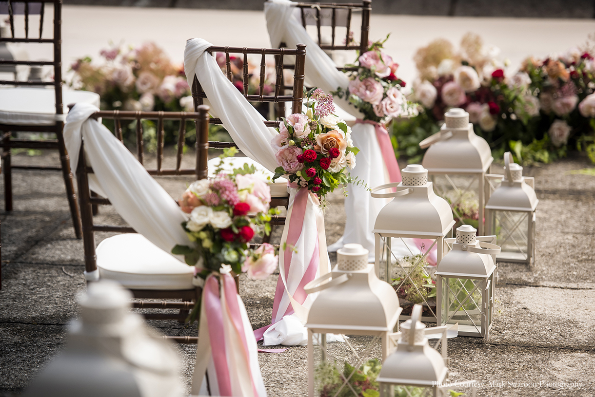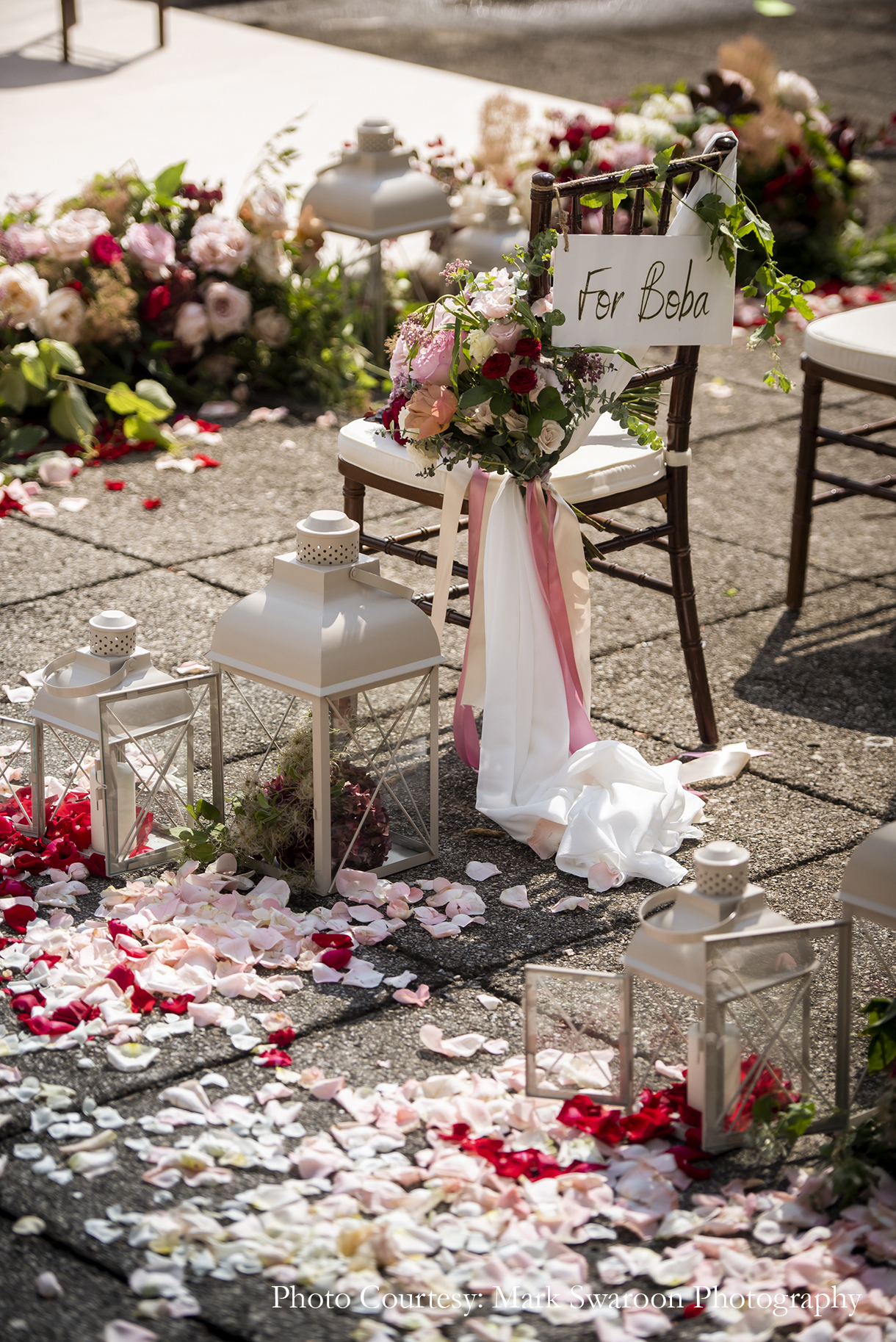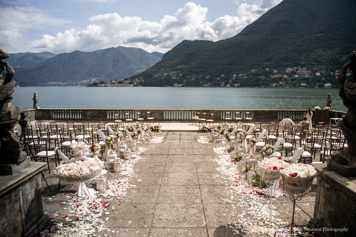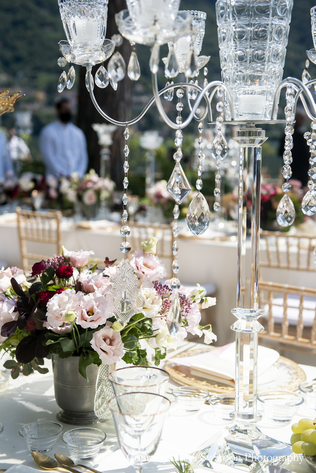 The exquisite venue of Villa Pizzo served as an idyllic setting for the romantic wedding ceremony, adorned with sculptures and floral arrangements. Rose petals carpeted the stone steps leading to the aisle, which was elegantly flanked by lamps and guest seating festooned with blooms. The couple exchanged vows framed by the beauty of the lake as their stunning, after which followed a refined seated luncheon.