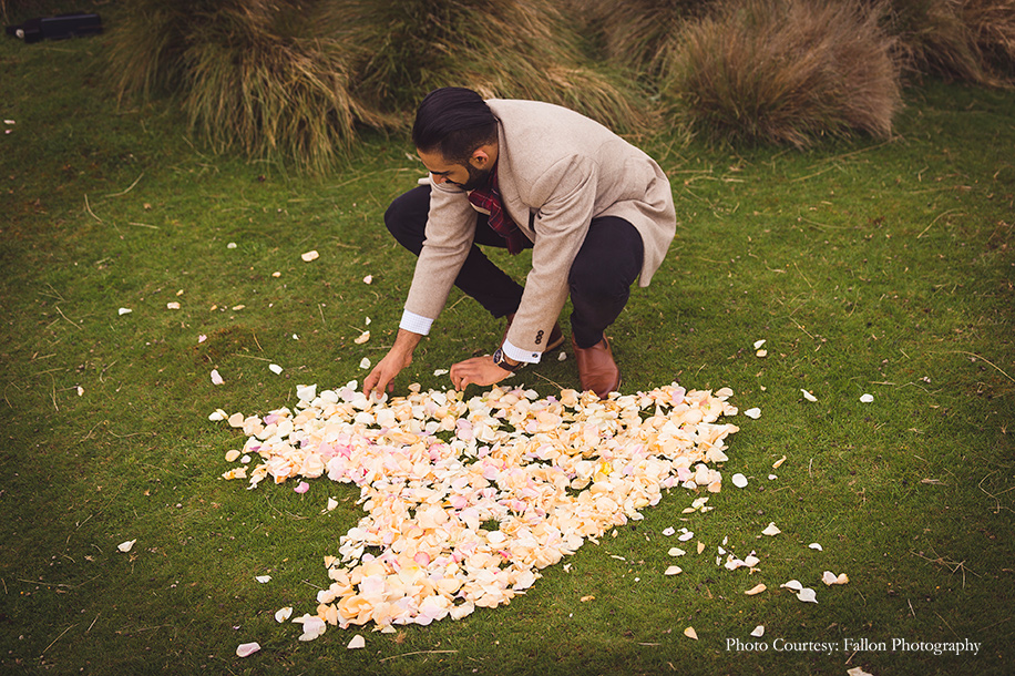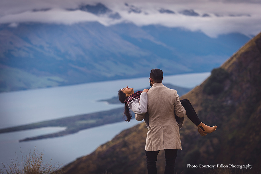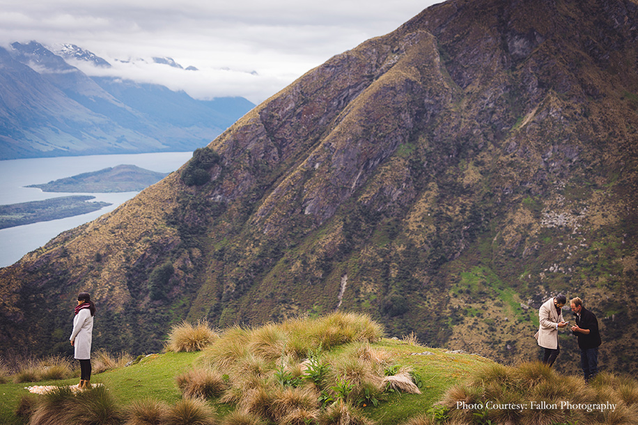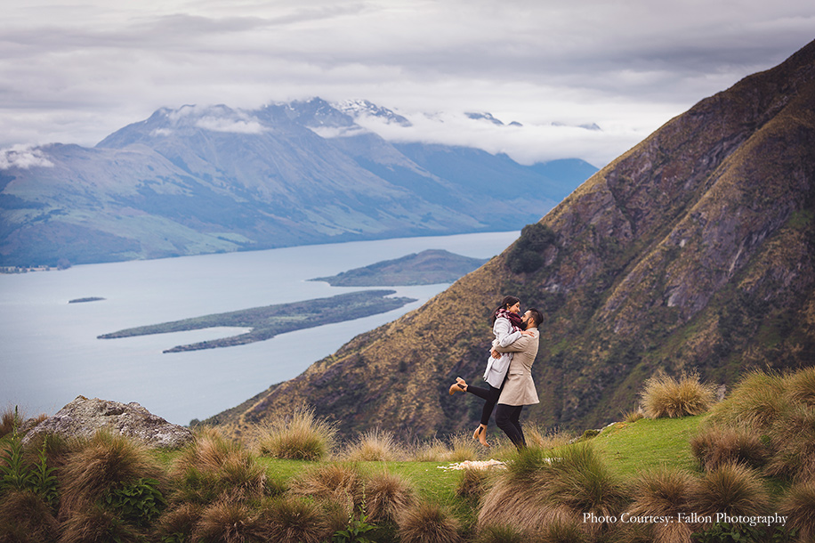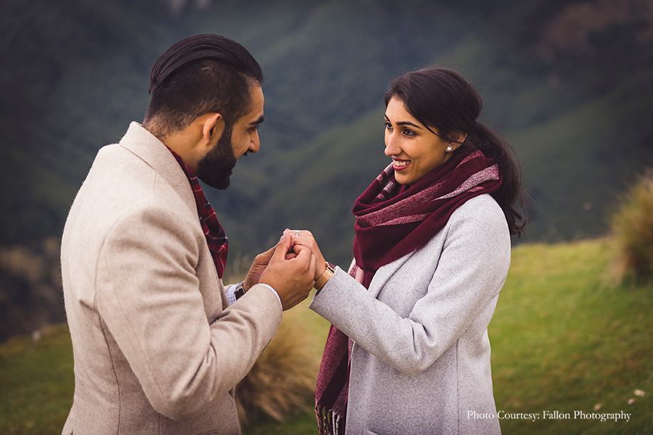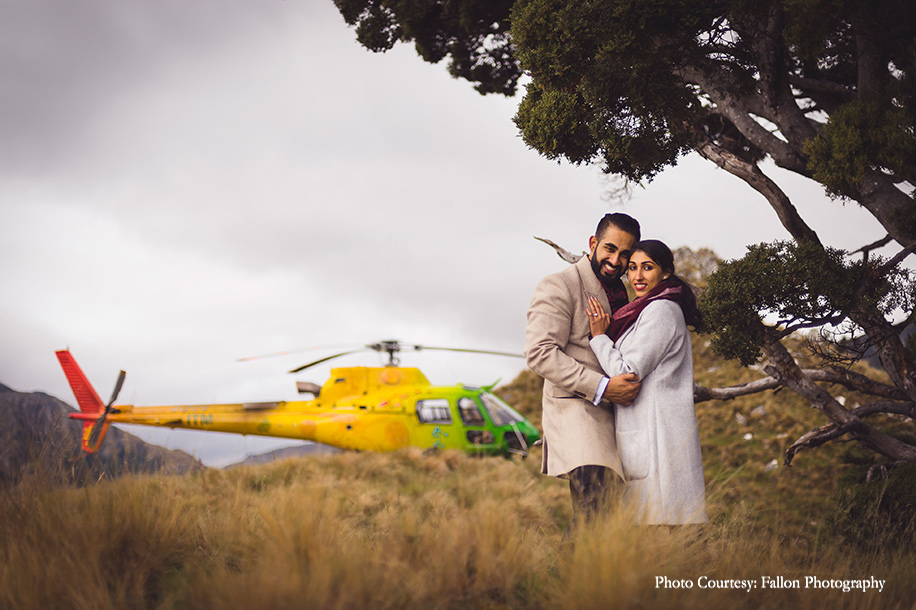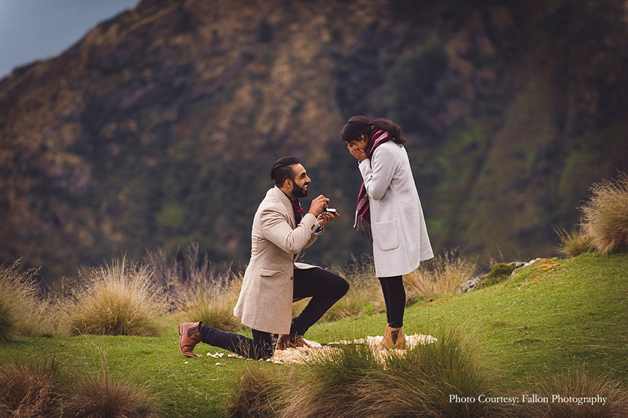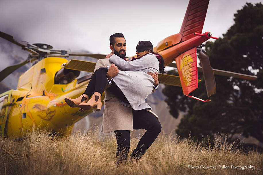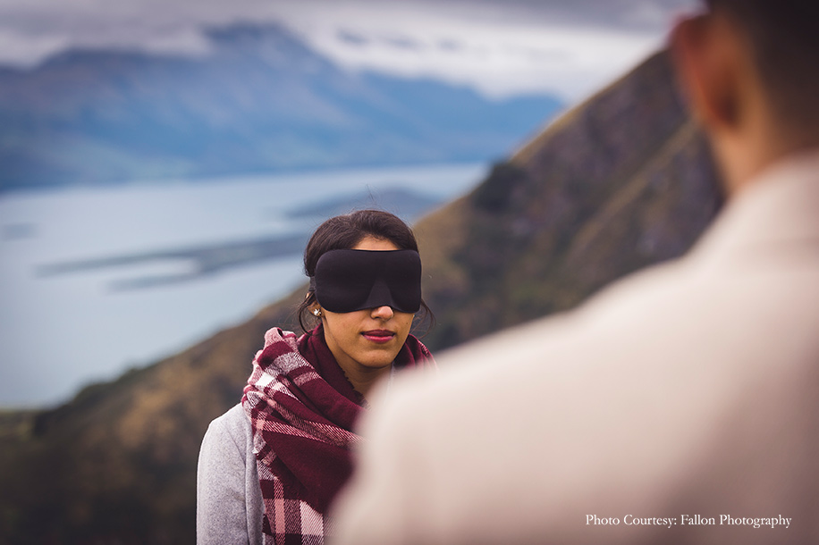 “After countless rescheduling due to torrential rainfalls, the special day arrived. Being an avid wildlife enthusiast, I was tricked into believing that we were going on a mountain to spot the native wildlife. The thought of sharing the helicopter with camera persons didn’t cross my mind since that was the only available flight due to the non-stop rains. As soon as we reached, I was blindfolded and made to stand on a heart made of rose petals placed on the lush grass of the mountainous terrain in Queenstown, New Zealand. When I opened my eyes, Rustam was down on one knee, asking my hand in marriage. In complete awe and excitement, my ‘Yes’ was followed by a sigh of relief to know the real reason behind Rustam being hooked to his phone on holiday. This auspicious occasion was topped off with a champagne celebration and a lovely drive home from Glenorchy to Queenstown.”