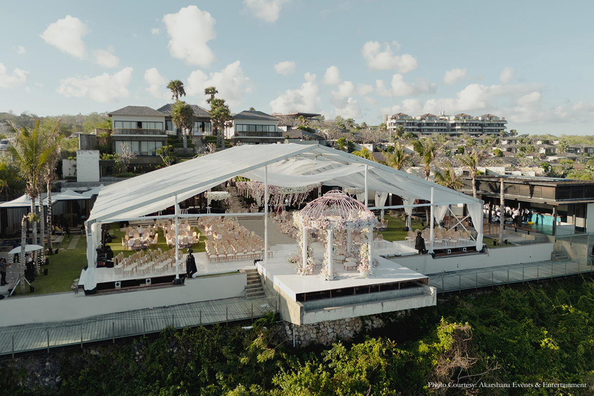 Next in line was the Bali-inspired mehndi, as Shravan shares, “In the evening, the Mehndi brought the spirit of Bali to the celebration. Every detail—from the décor and linens to the Wayang-inspired elements—was meticulously designed. The night came alive with a mesmerizing performance by a live band, leaving everyone spellbound.”