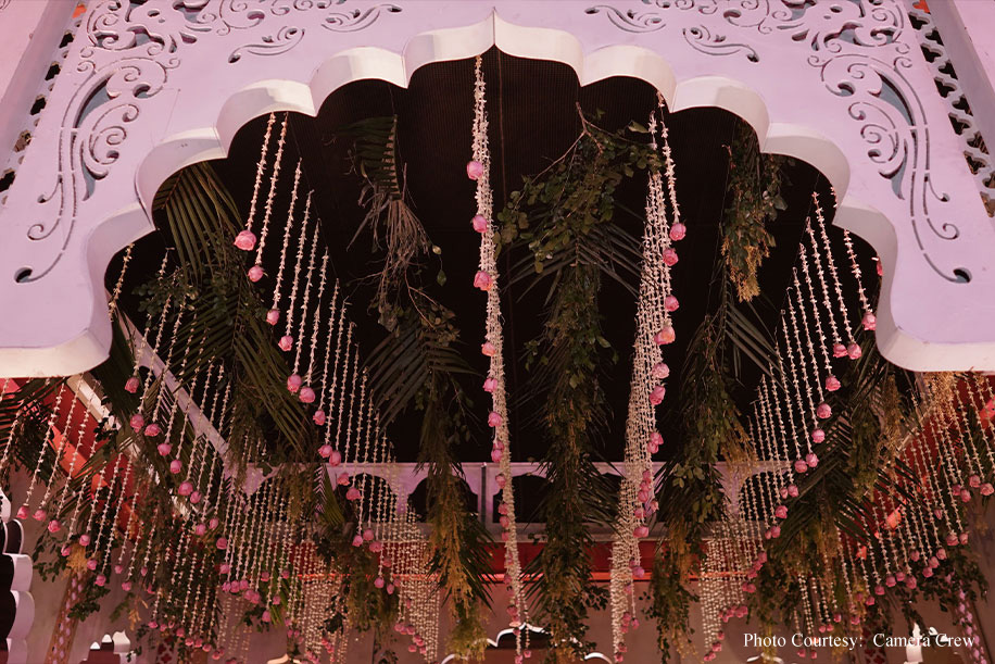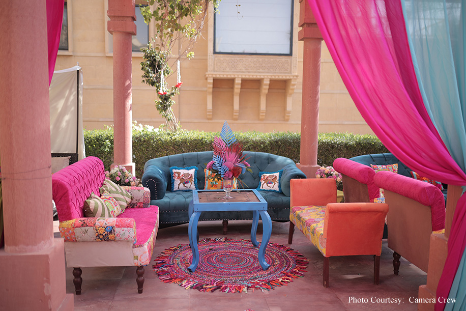 The next morning began with a mehndi function brimming with colorful decor and lively moments. Brightly colored drapes, flowers, quirky local crafts, prints, and textures made up the decor, lighting up the palatial courtyard.