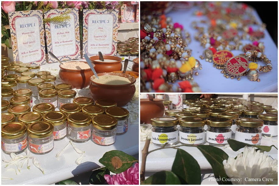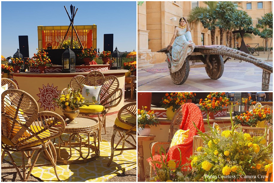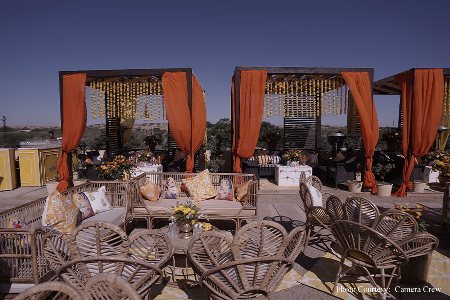 The final day dawned with a sunkissed haldi morning. The earthy, lounge-style decor was full of rattan furniture, cabanas with floral canopies, refreshing flower arrangements of white and yellow, and more, putting a chic, modern twist on the traditional ritual.