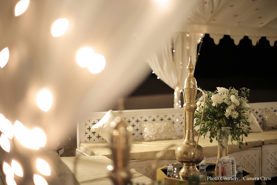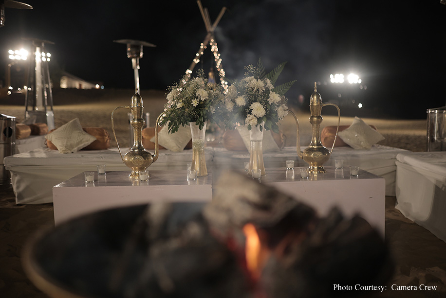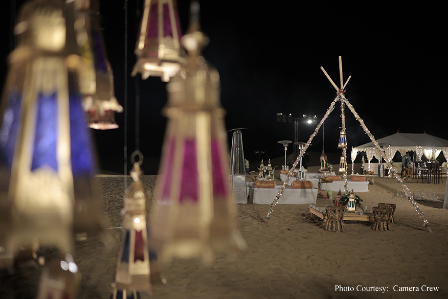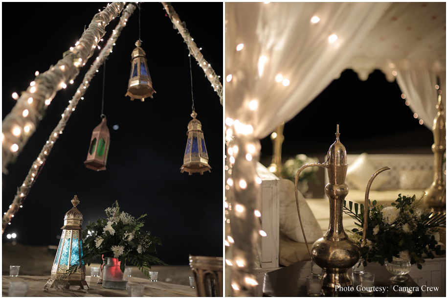 Hosted on the iconic Bordi Dunes, the Sangeet evening was the highlight of the destination wedding getaway. Breezy teepees, fairy lights, Moroccan lamps, and more came together to set a magical ambiance for a night of music, dance, and entertainment. The couple flaunted haute couture for the evening and left everyone entranced with their style.