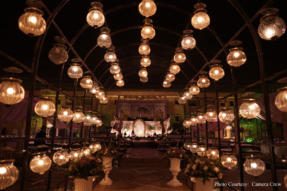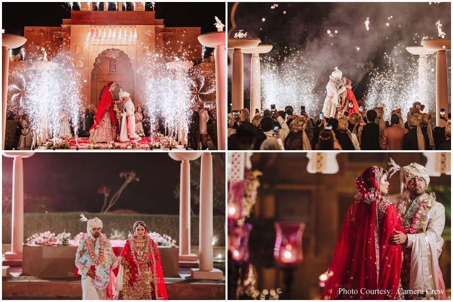 Abound in grandeur, the wedding ceremony was a royal affair with decadent decor and sparkling festivities. Vintage lamps, magical lighting, and plush floral arrangements set a regal tone, while the nuptials saw fireworks and splendor as the couple tied the knot.