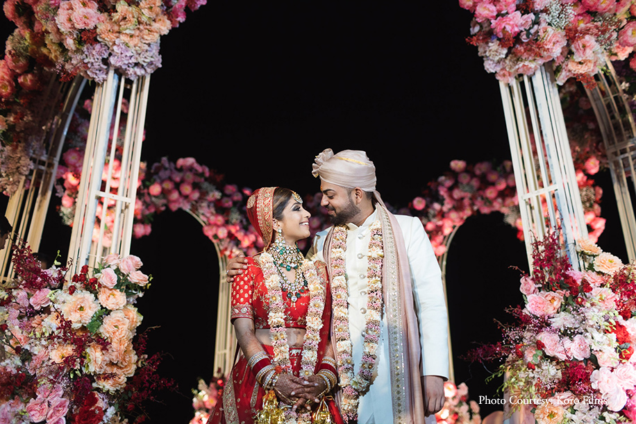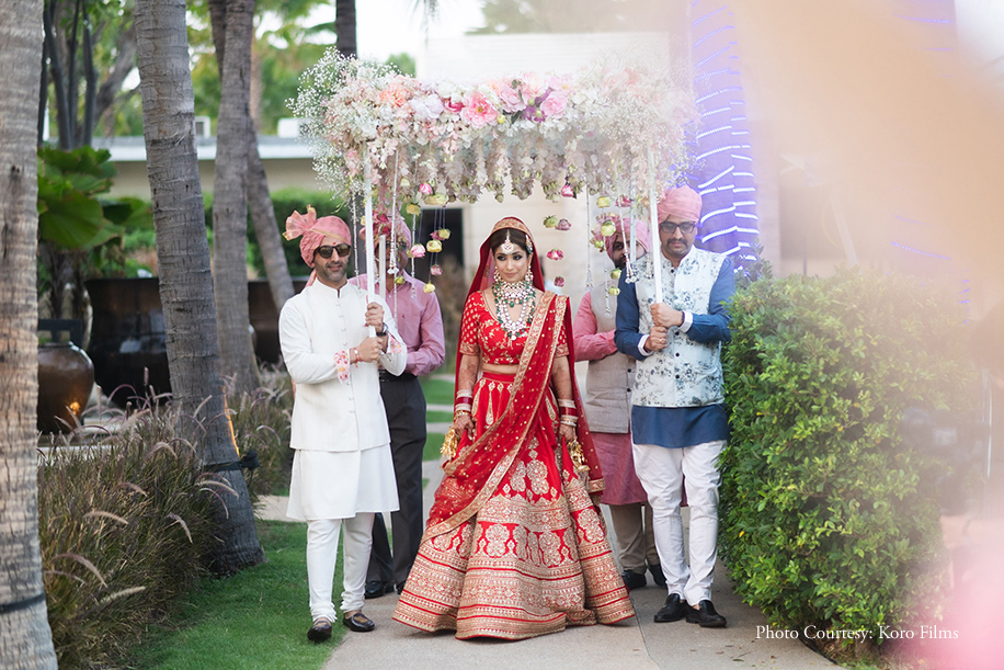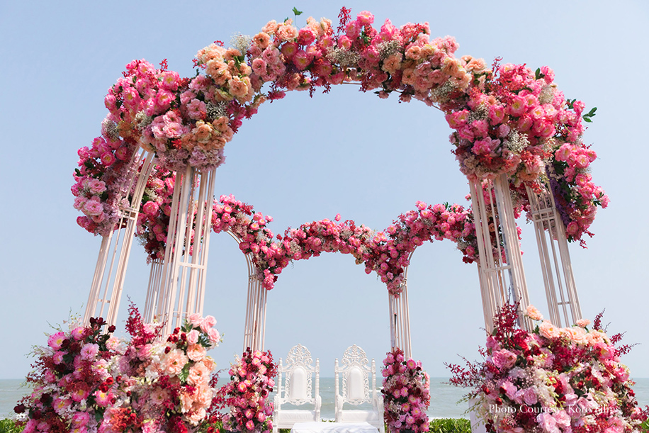 Crafted in shades of pinks and reds, the wedding festivities were held in a sensational open gazebo mandap festooned with endless blooms, a stunning sight against the rolling blue waves. Clean white structures and Pampas grass added a contemporary elegance to the brightness of the flowers. The groom complemented his bride as he arrived for the baraat in a classy vintage red car.