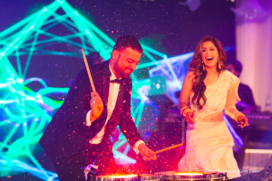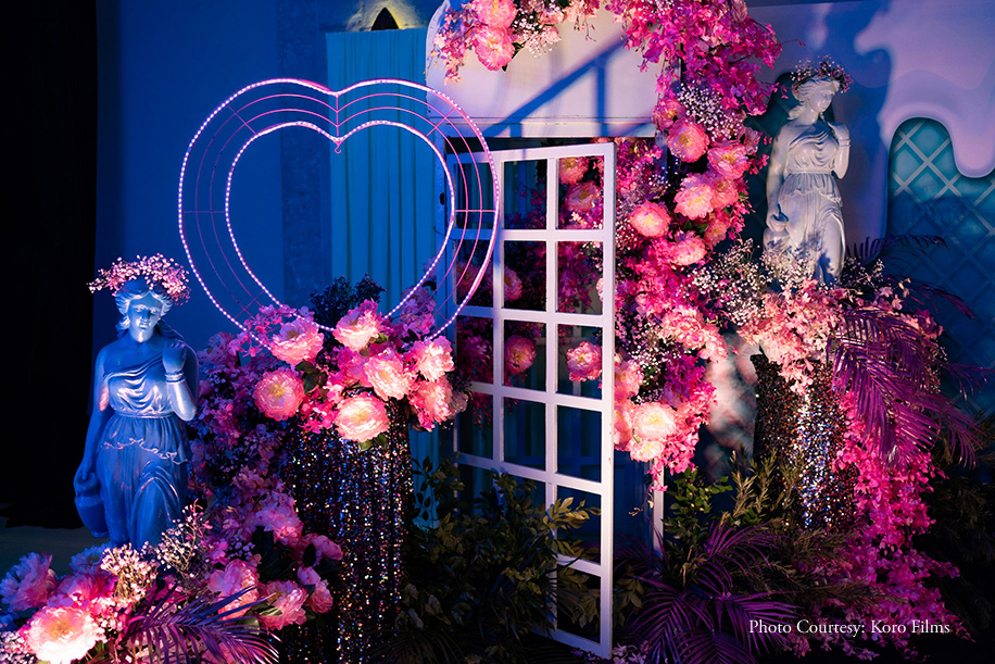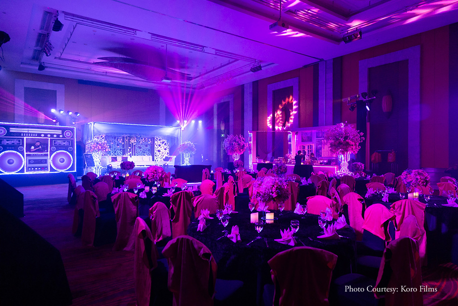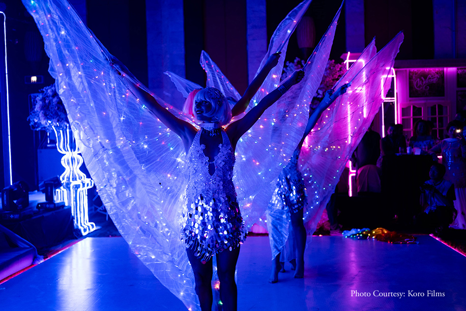 Bold colors and neon lights set the mood for the glam Sangeet. Tropical floral and foliage arrangements dotted the event, while the colossal stage and a stylish boombox DJ booth captured everyone’s attention. Dancers in shimmering outfits and swishing wings looked like disco era angels, while intoxicating blue and violet lights bathed the festivities in a psychedelic glow, making for an arresting sight.