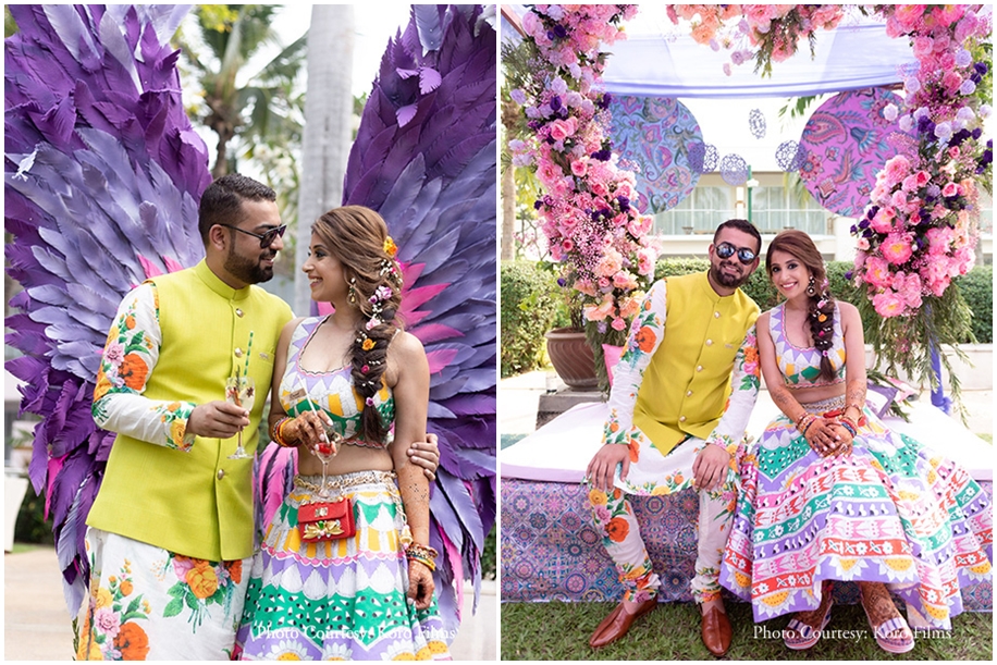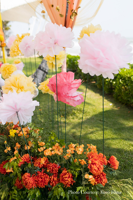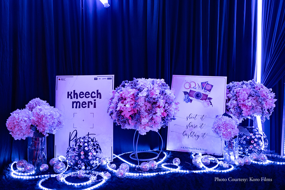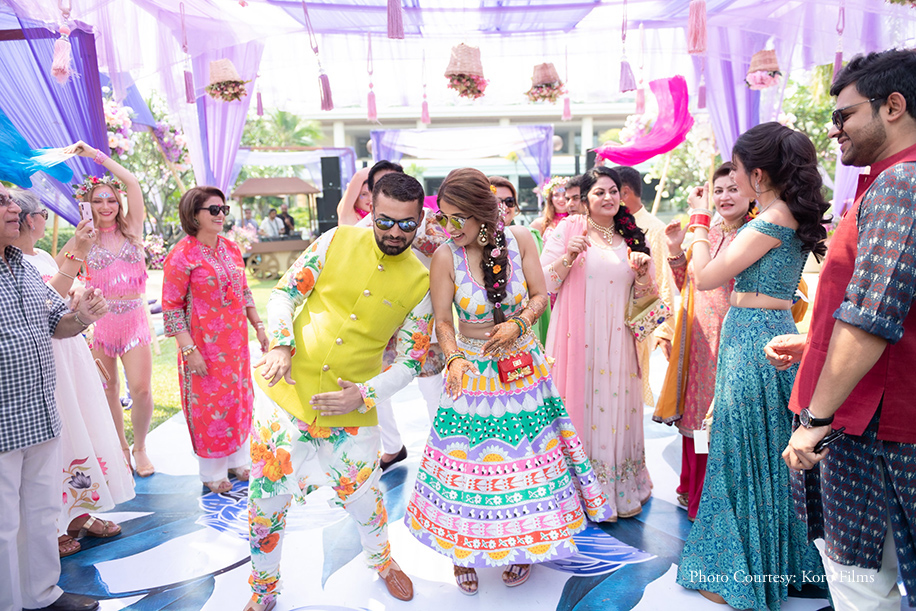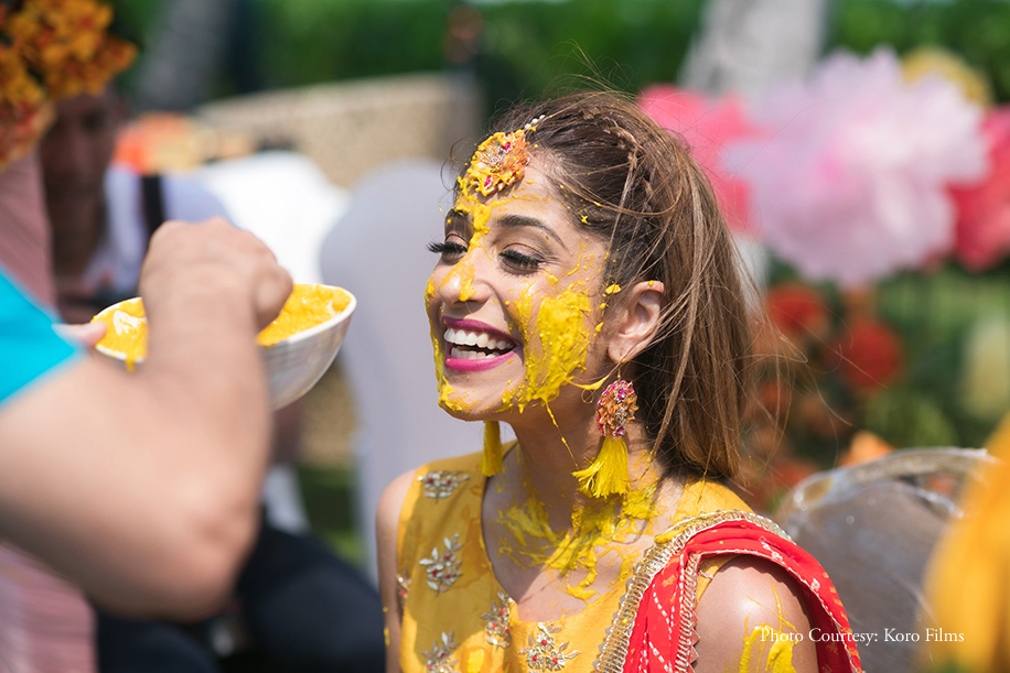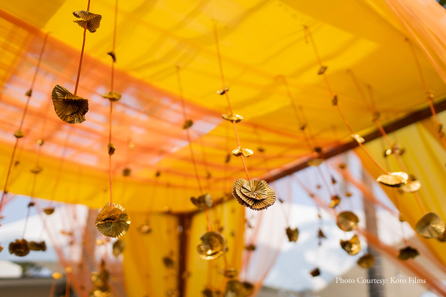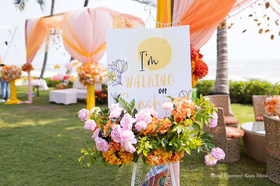 The vibrant Haldi décor exuded carnival like joy in hues of yellow, orange and blush that looked incredibly fresh against the blue seas. Cheerful pink and orange blooms, quirky props and uplifting fun quotes lent a charming, youthful energy to the function.