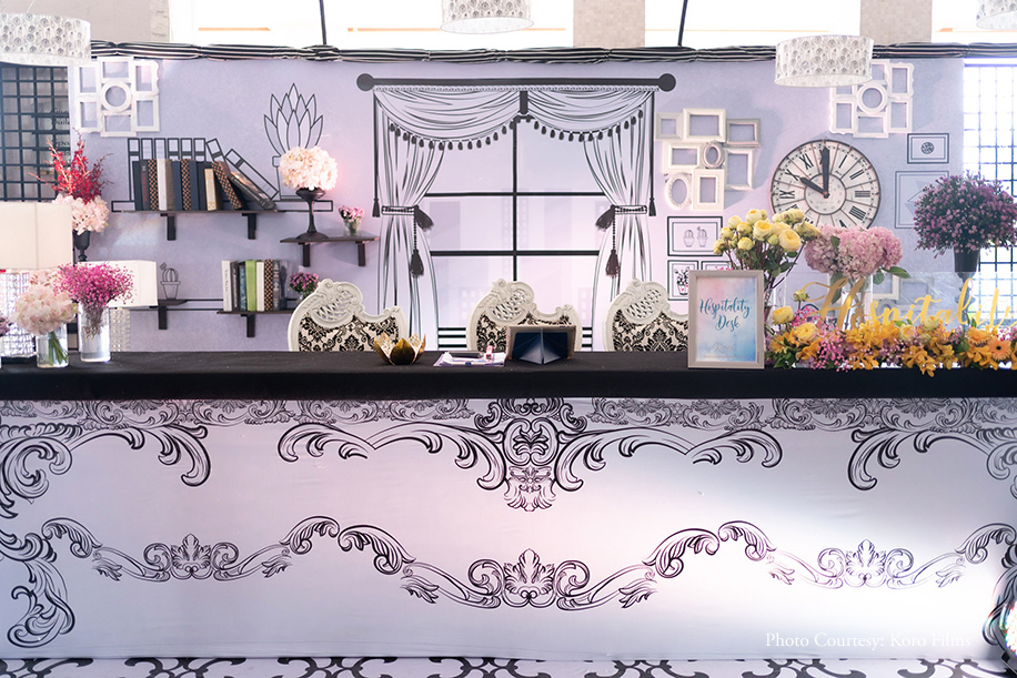 The revelries began right at the gorgeously decked hospitality desk that was right out of the sketchbook. The vintage illustrated vibe of the desk was contrasted with a flirty pop of colorful flowers.