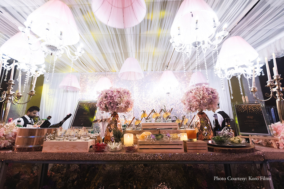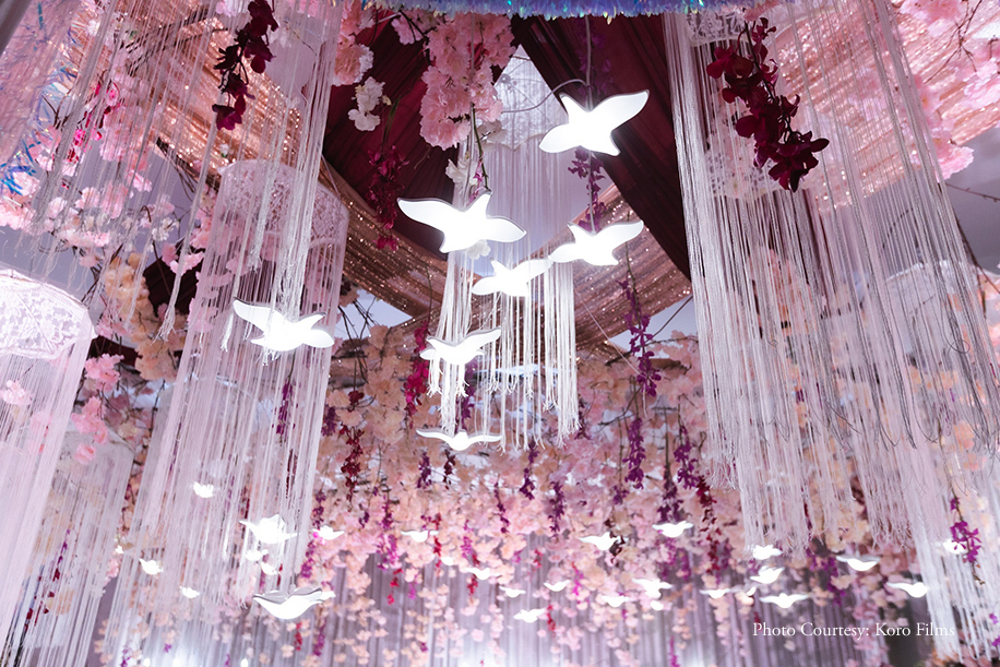 Brimming with bohemian magic, the lavender hued Mehendi festivities saw spring blooms, teepees, drapes and a canopy of upside-down flower baskets over the merriment. Barefoot professional dancers clad in spritely shimmering outfits reminiscent of gypsies and a statement installation of lavender ombre wings embodied the theme perfectly.