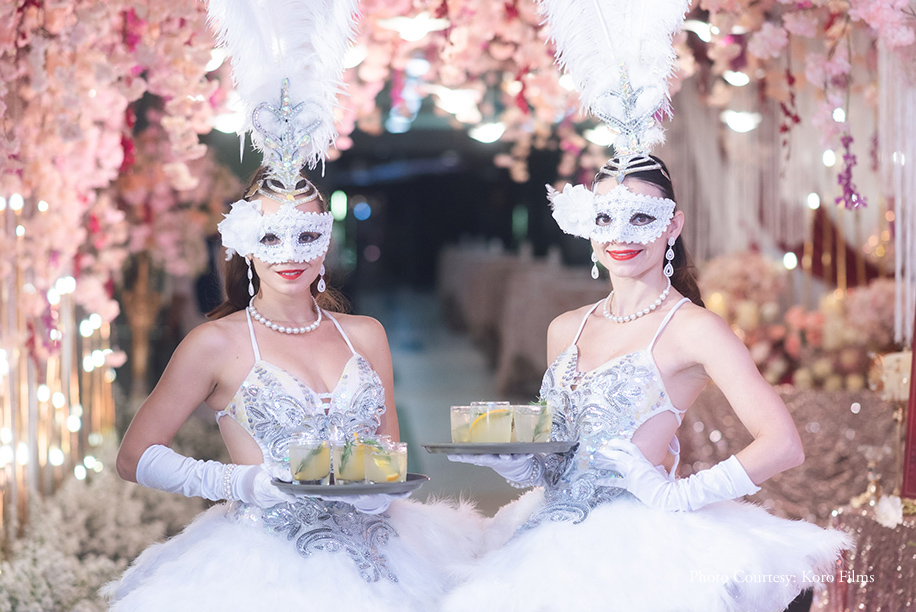 The festivities came to a classy conclusion with a formal ball-like reception. Dusty rose and champagne gold hues set the tone of muted decadence for the evening, adorned with extravagant floral set ups, crystal chandeliers, bird motifs and more. Elegant drinks and dazzling dancers welcomed the guests.
