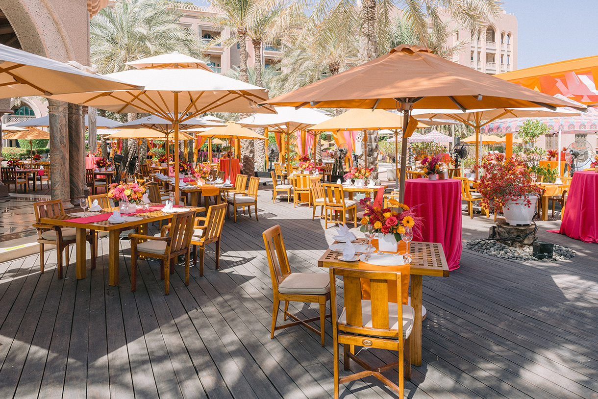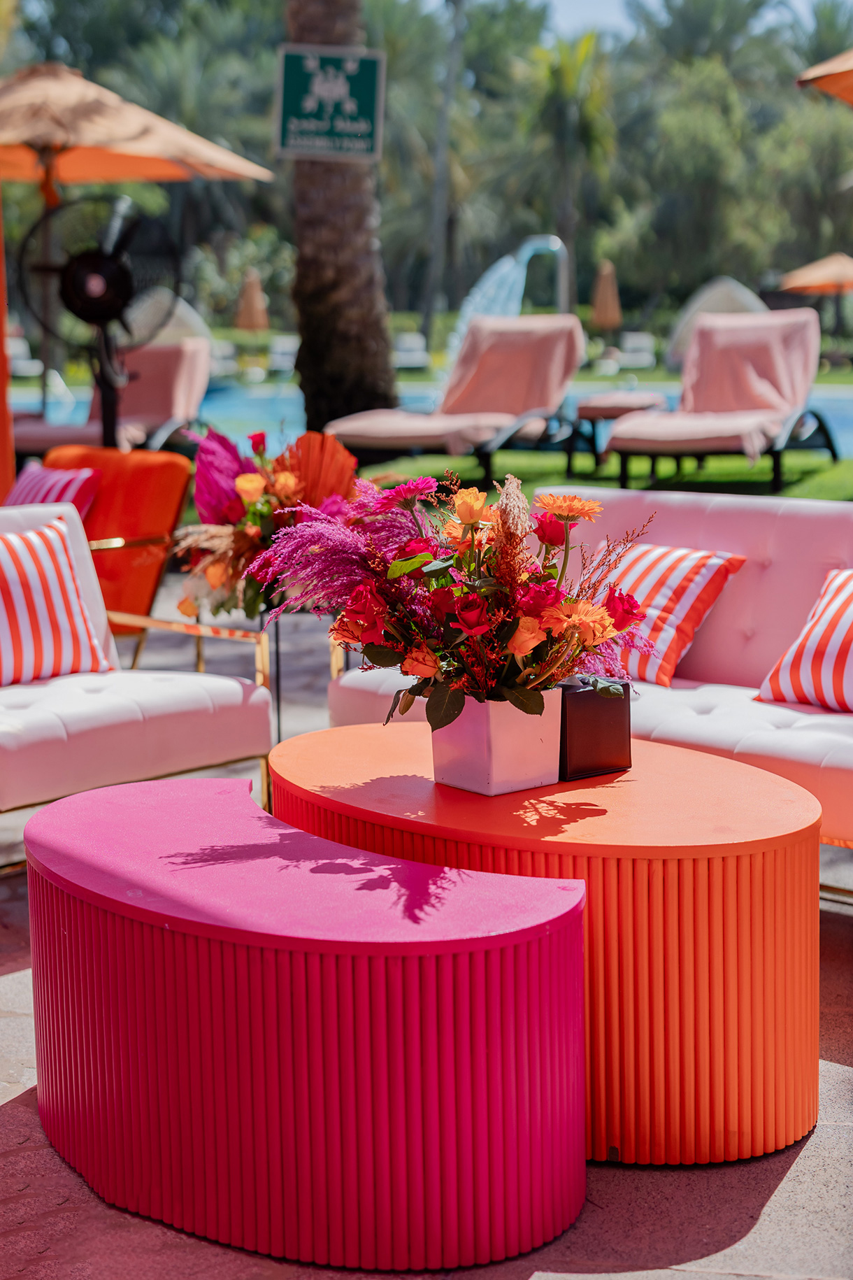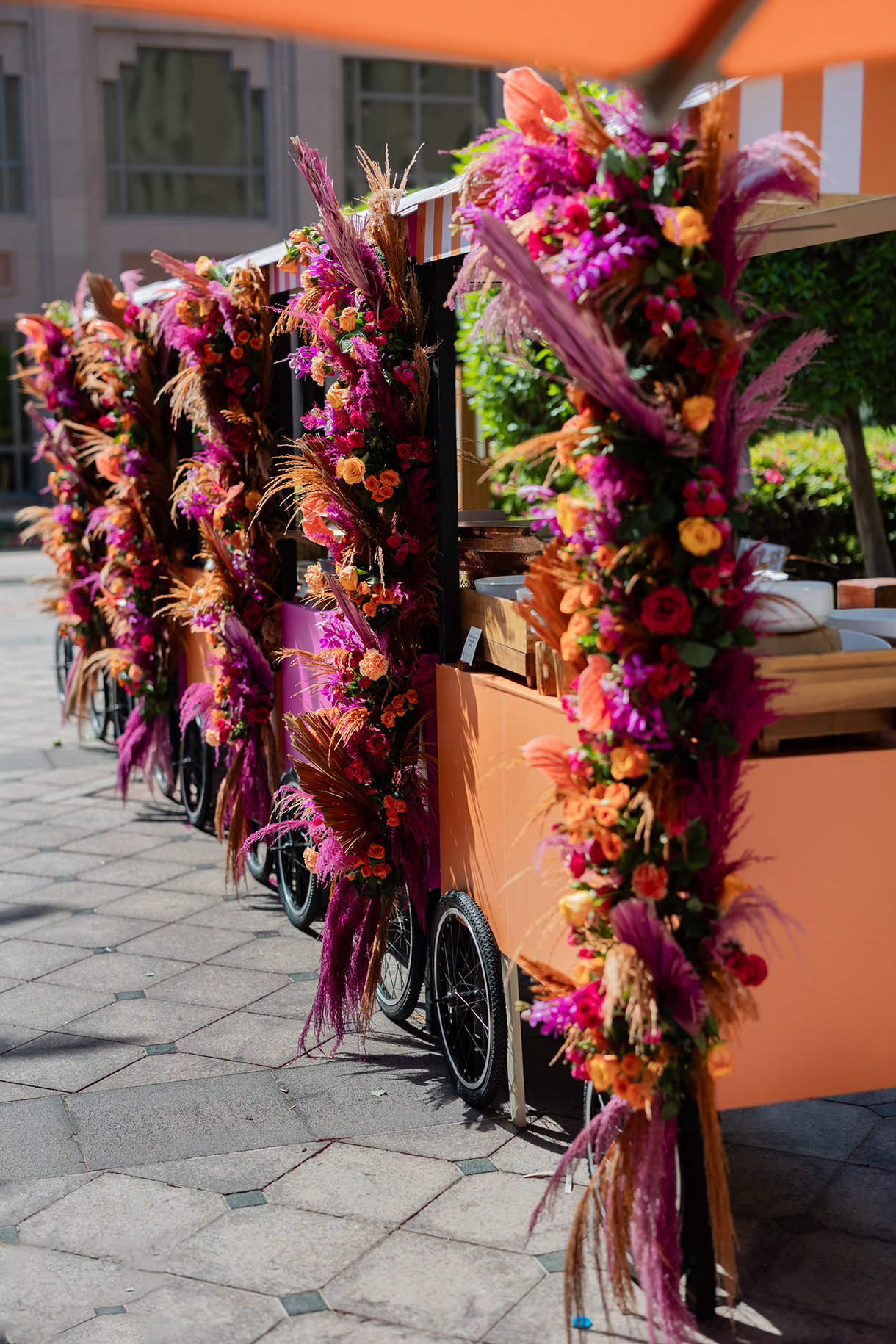 The next day, guests were transported to a vibrant Mehendi Pool Party, a riot of pinks and oranges splashed across the venue. Laughter echoed as the emcee took the mic, and the water drummer elevated the celebration with a percussive water performance unlike anything the guests had ever seen. True to their spirited personalities, Sonya and Shreyans made a memorable entrance on a vintage Vespa, winning hearts as they kicked off the festivities. “This event was about pure fun, energy, and showcasing the couple’s dynamic side,” said Bhavnesh. “Every element was tailored to reflect their love for music, colour, and movement.”