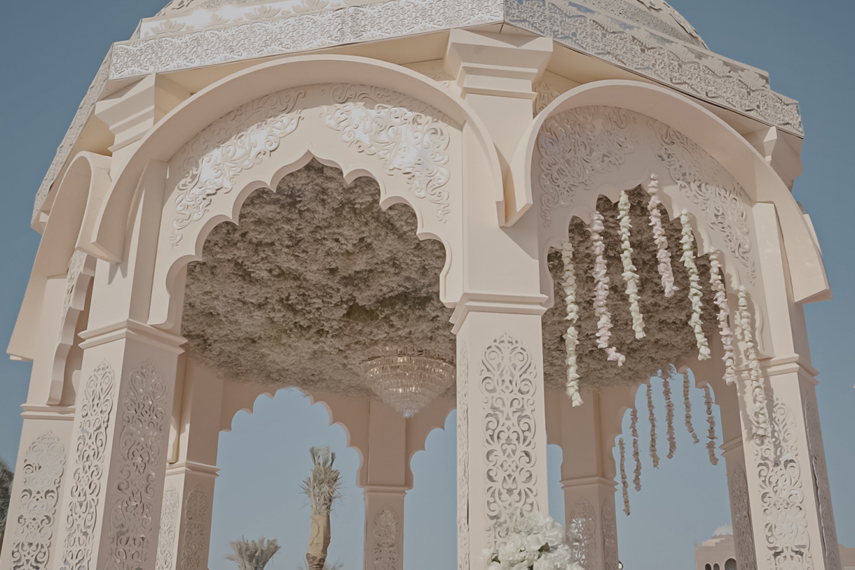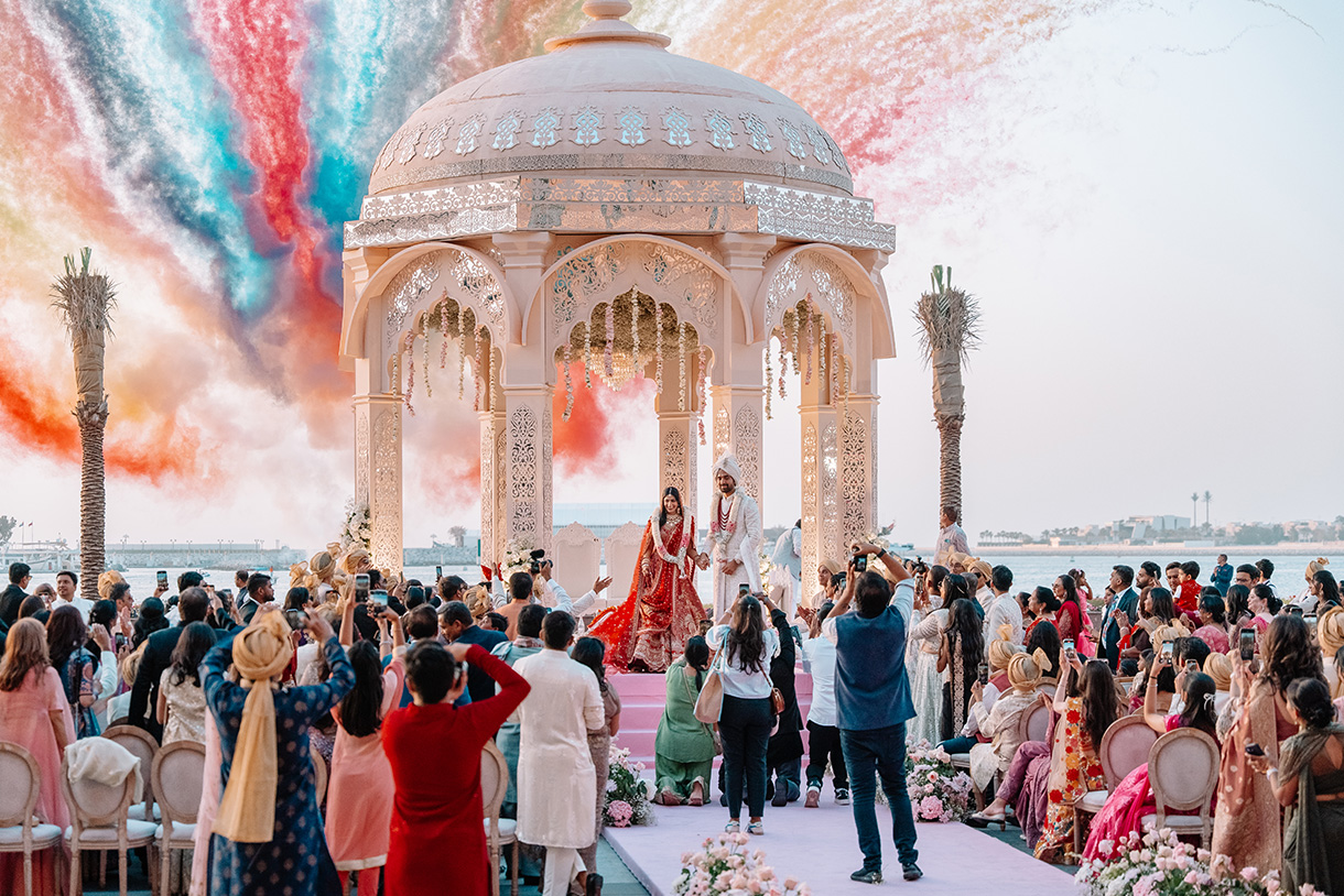 The final day unfolded with grandeur at its peak. The Emirates Palace, with its regal arches and golden hues, served as the perfect setting for the main ceremony. At the centre stood a dome adorned with intricate mirror work, a tribute to Indian artistry brought to life with contemporary finesse.