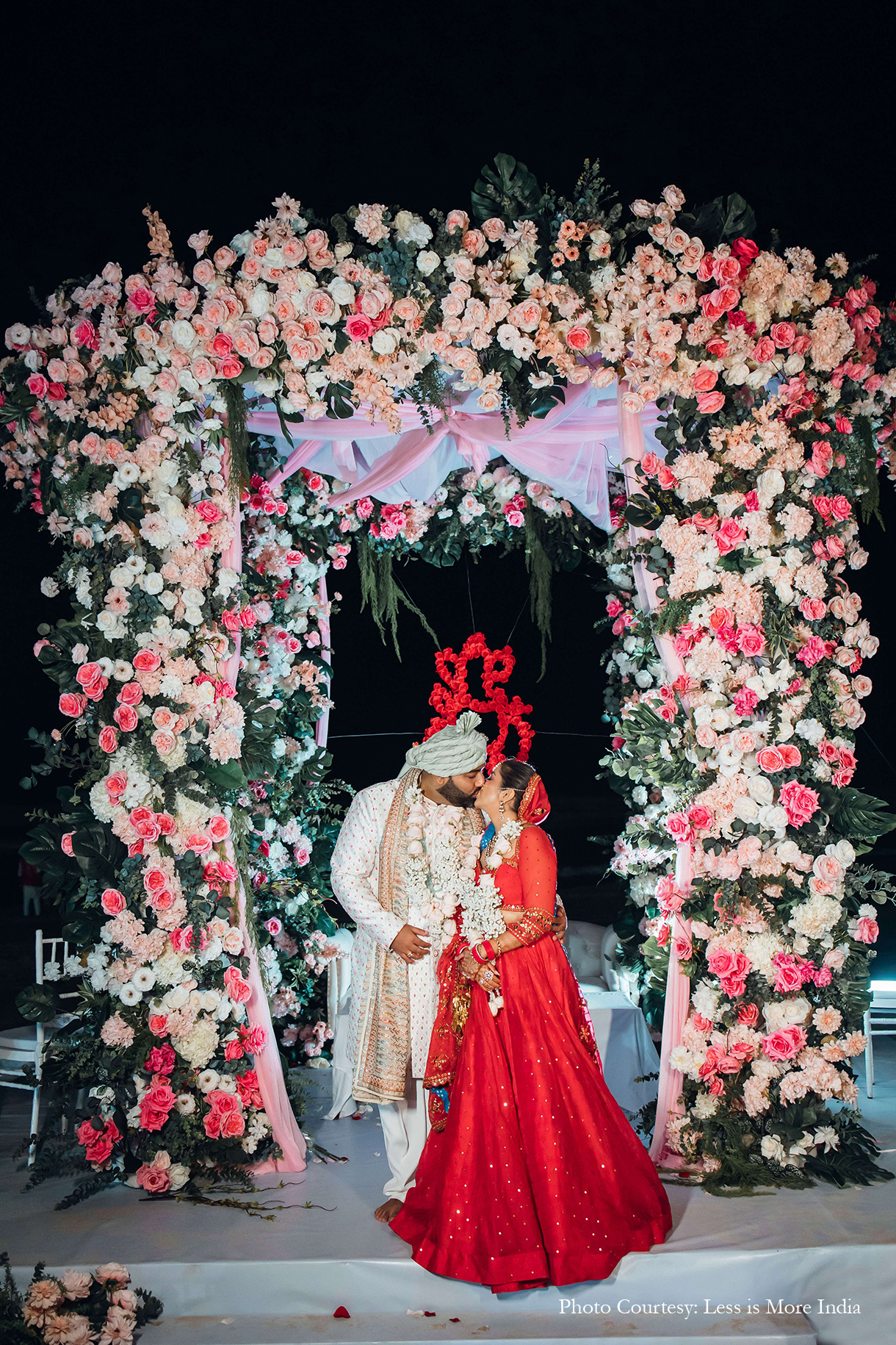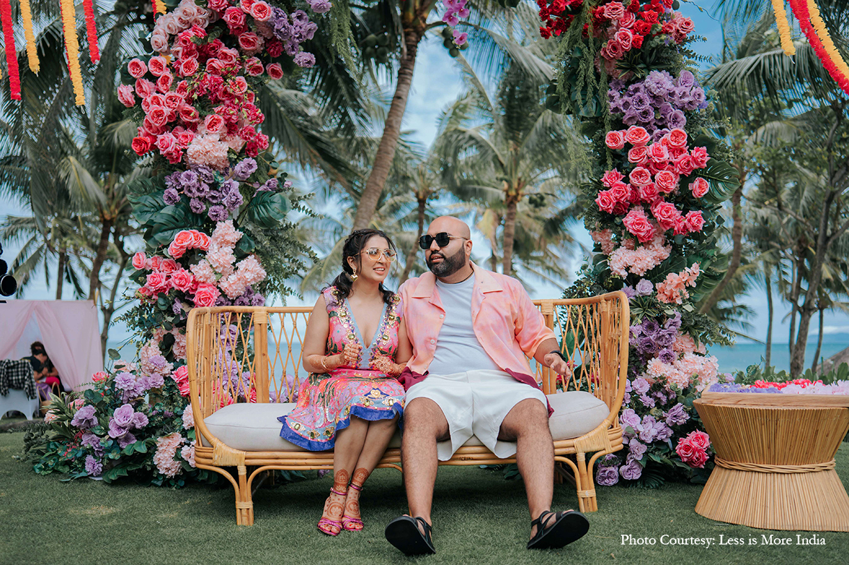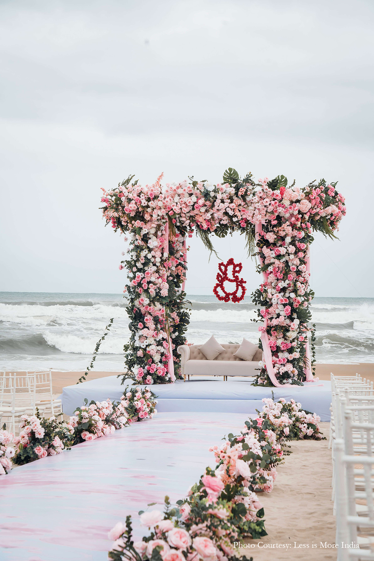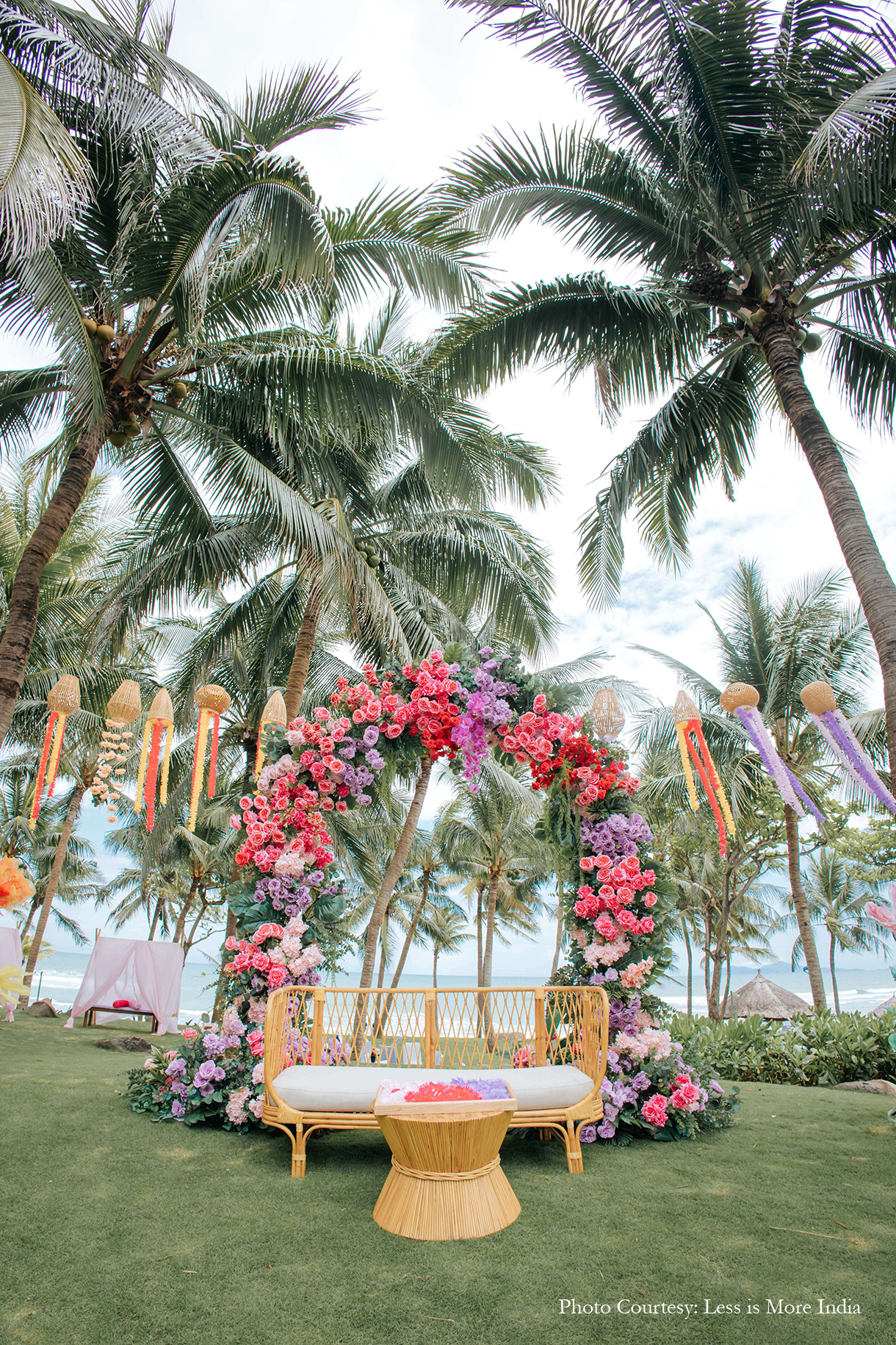 With Non-Nuoc Beach by the wedding venue, it came as no surprise that the couple chose to host their phera ceremony by the beach. Bhisham’s baraat was a lively one as his loved ones danced their way to the beach on a path surrounded by lush greenery. Dressed in purple outfits, the groom’s side cut a striking contrast with the backdrop, resulting in some truly vibrant pictures. Bedecked with pink and white blooms and backed with a floral Lord Ganesha, the beachside mandap made jaws drop. As the bride walked the aisle, the guests got a clear view of the mandap and the foamy sea waves while being seated on ivory-hued chairs.