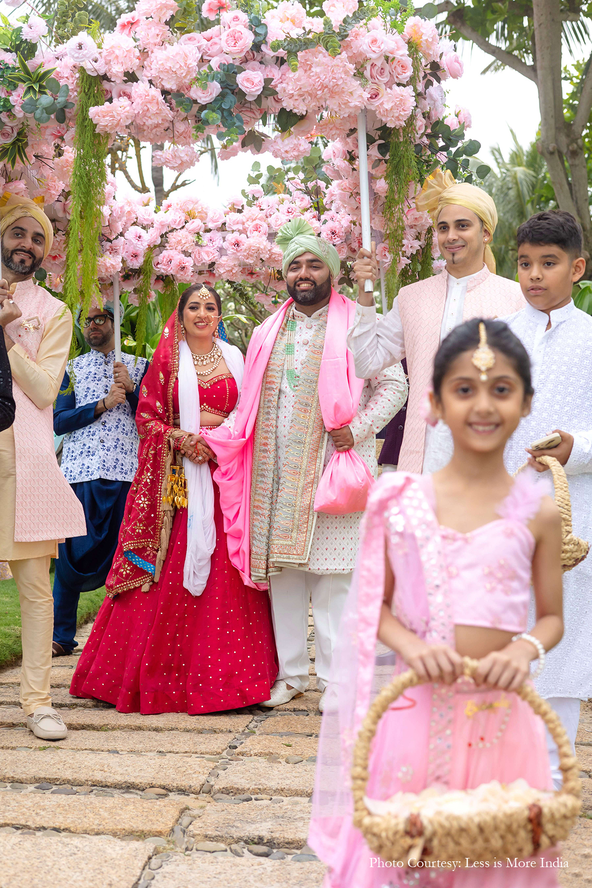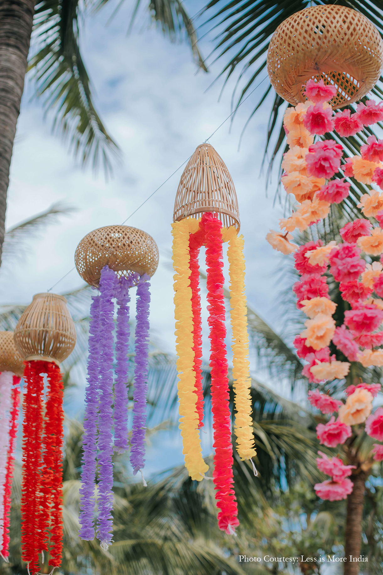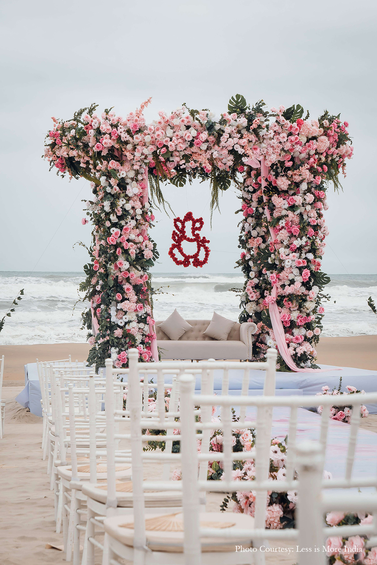 With Non-Nuoc Beach by the wedding venue, it came as no surprise that the couple chose to host their phera ceremony by the beach. Bhisham’s baraat was a lively one as his loved ones danced their way to the beach on a path surrounded by lush greenery. Dressed in purple outfits, the groom’s side cut a striking contrast with the backdrop, resulting in some truly vibrant pictures. Bedecked with pink and white blooms and backed with a floral Lord Ganesha, the beachside mandap made jaws drop. As the bride walked the aisle, the guests got a clear view of the mandap and the foamy sea waves while being seated on ivory-hued chairs.