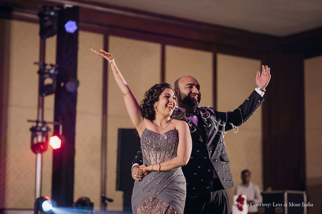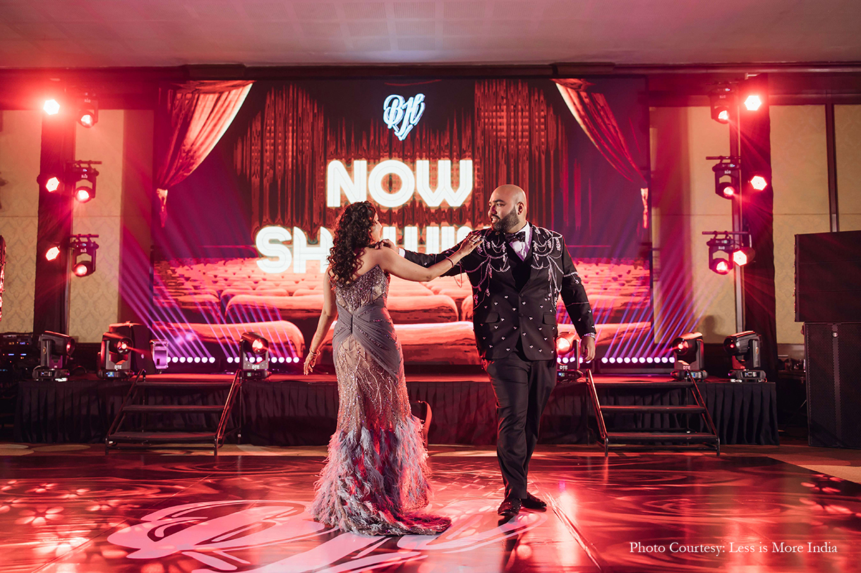 The Grand Ballroom played host to the sparkling sangeet evening that followed the mehndi. Colorful lights, a vast stage and the couple’s monogram adorned the venue. Energetic and enthusiastic – the couple took the stage by storm with their dance performances.