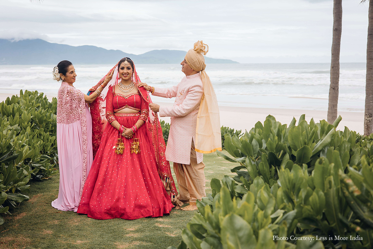 Nature lovers at heart, Heena and Bhisham wanted to host a lively wedding celebration surrounded by the bounties of nature. And, Vietnam with its untouched beauty, impeccable hospitality and accessibility came through as the top choice. Perfectly blending Vietnamese charm with modern luxury, Danang Marriott Resort & Spa had the couple smitten from the very beginning. The Indochina-inspired resort’s 200 spacious hotel rooms and suites, along with 39 private pool villas with views of lush gardens and the glistening sea ensured the wedding guests were indulged to the hilt at this destination wedding.