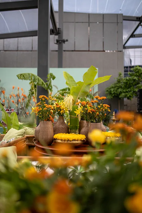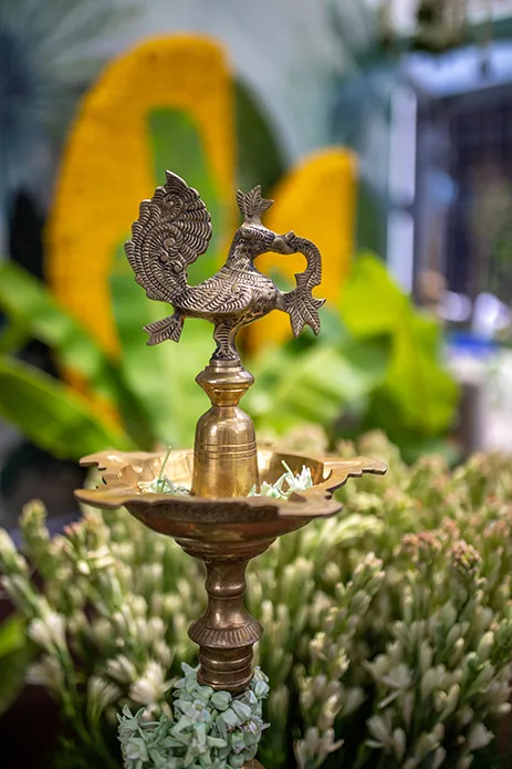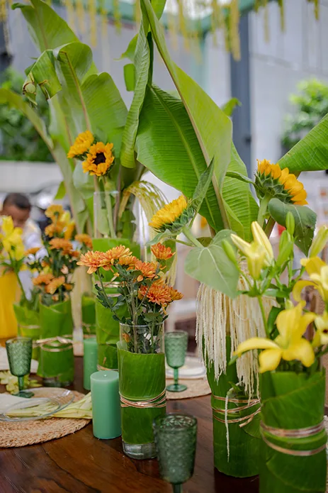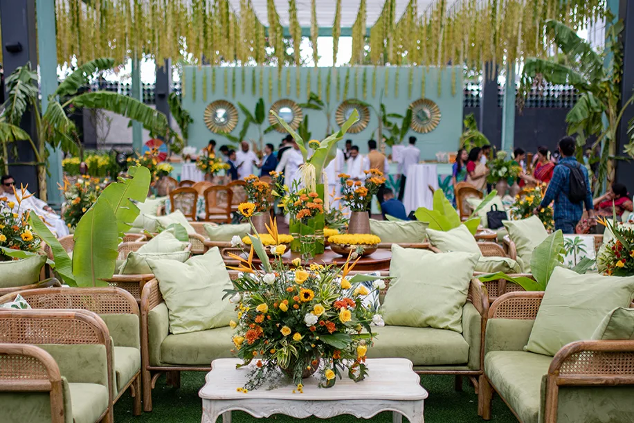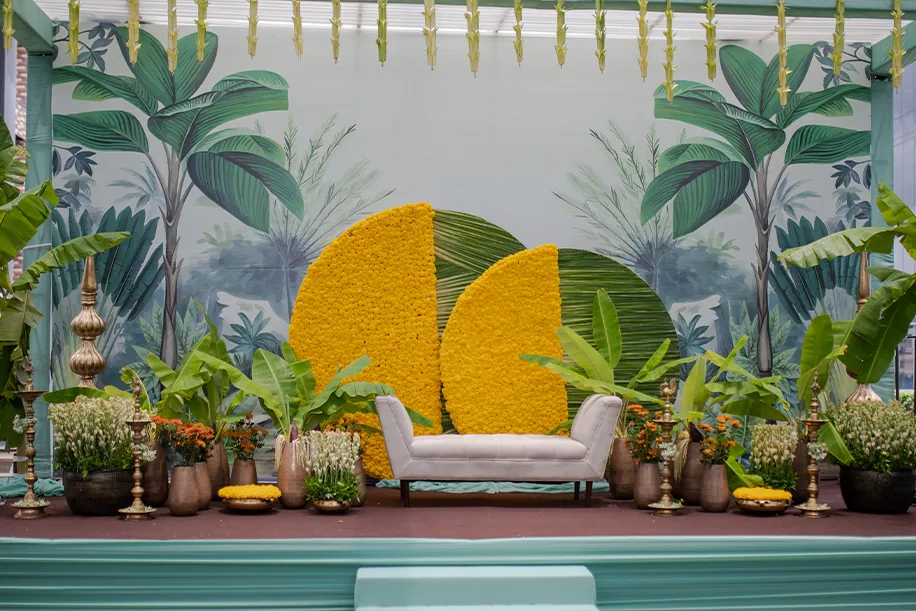 The next morning dawned with the flavors of South India as the couple welcomed their guests to their beautiful Haldi ceremony. The sunny vibrance of marigolds was contrasted with the earthy serenity of banana leaves, brass elements, rattan furniture, and more, for soothing yet stunning aesthetics. Imagined with a stunning tropical backdrop and a stylish floral wall, the haldi stage was the focal point of the occasion.