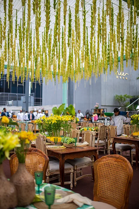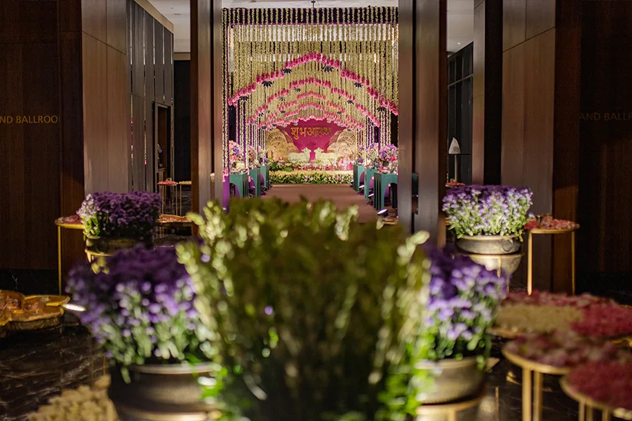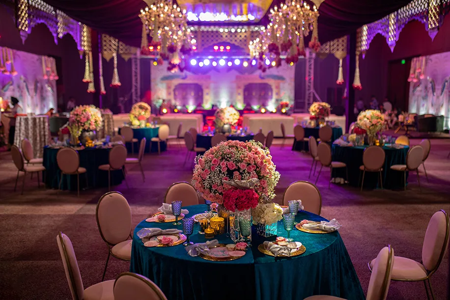 For their wedding, the couple wanted a blend of tradition and modernity with great ambiance and good weather and chose the property of Hilton Garden Inn Bengaluru Embassy Manyata Business Park. They entrusted the planning and execution of their celebrations to the team of Showkraft Designer Weddings. Working in tandem with both families and the hotel, they ensured their ideas were brought to fruition while honoring their Marwari wedding customs and rituals. Everything from the decor to the technicians, specialty food catering like chaat etc was brought in from Delhi, while ace celebrity artists like Sonu Nigam and Guru Randhawa were flown in for stellar entertainment.