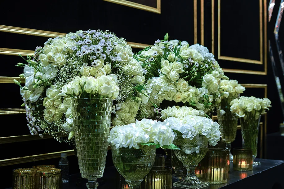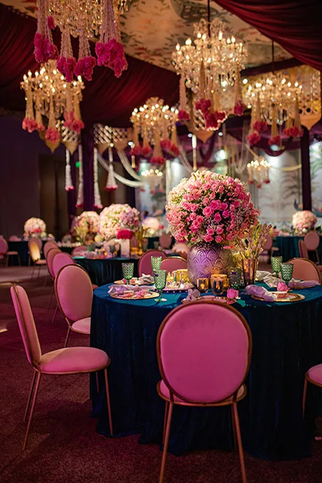 Brimming with glamorous decor, cocktails, and riveting entertainment, the Sangeet was a night of pure decadence. Drapes and plush furnishing in rich, dark hues enveloped the setting with luxury, elevated with crystal chandeliers and stunning arrangements of white flowers and candles. Crafted out of metal mesh and clouds of blooms, the table centerpieces took creative elegance to the next level. The evening saw a rousing mix of music and merriment as everyone enjoyed stunning performances by celebrity artists like Sonu Nigam and Guru Randhawa.
