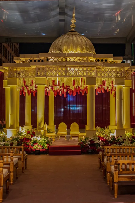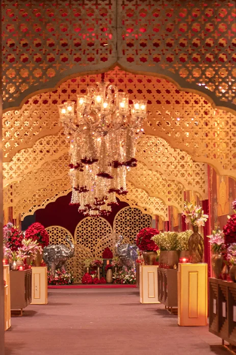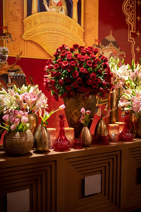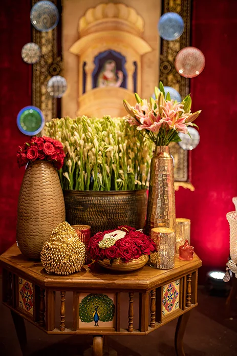 Imagined with a ‘Sabyasachi’-esque aesthetic, the wedding ceremony spelled royal opulence! Vases and candle votives lent their glow to the rich decor of red roses, traditional artworks, ornate carpets, metallic ornaments, and more, creating a vision of grandeur from the entrance to the wedding hall. The regal gold mandap reflected temple architecture, casting an auspicious aura over the ceremony.